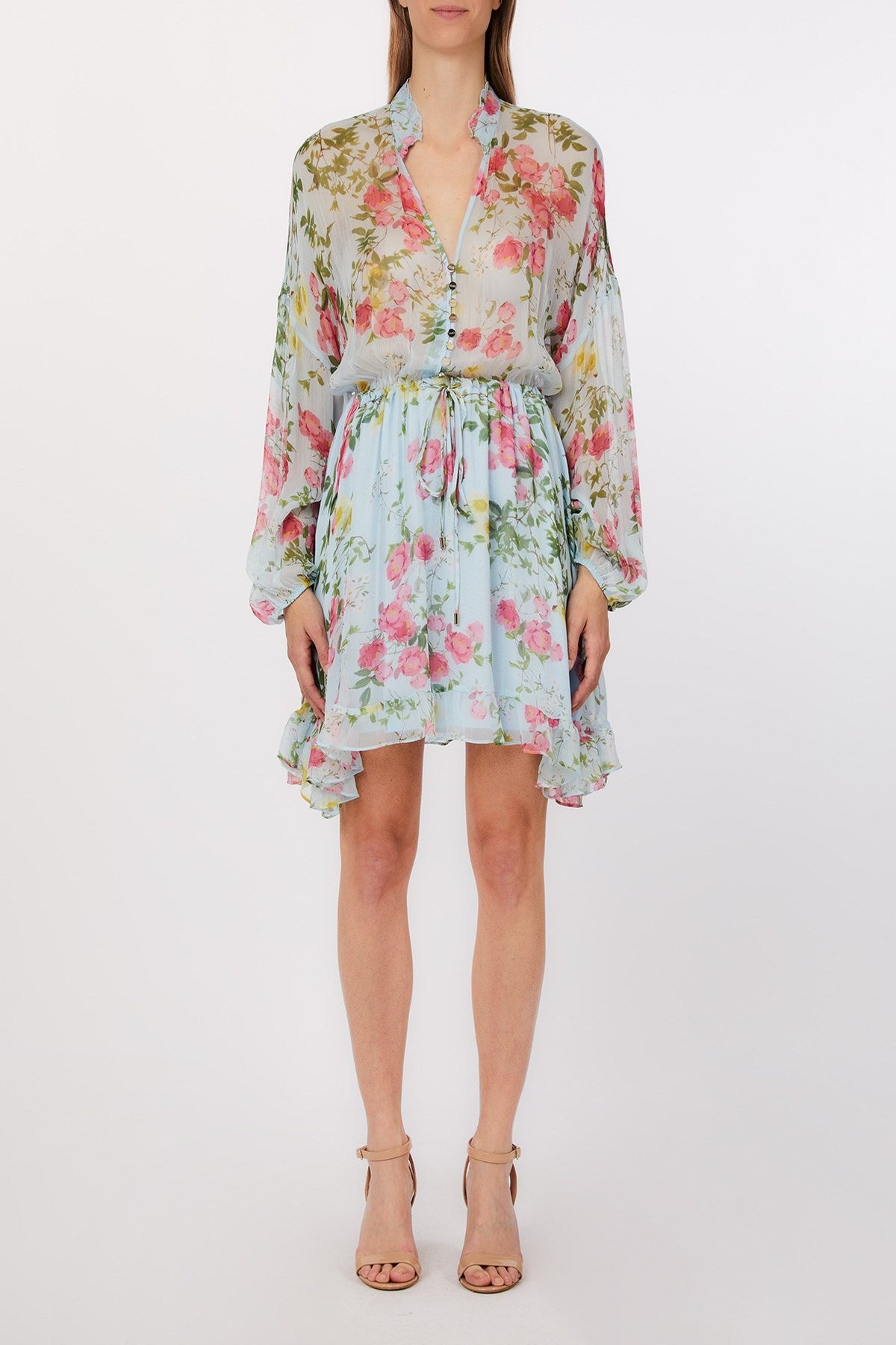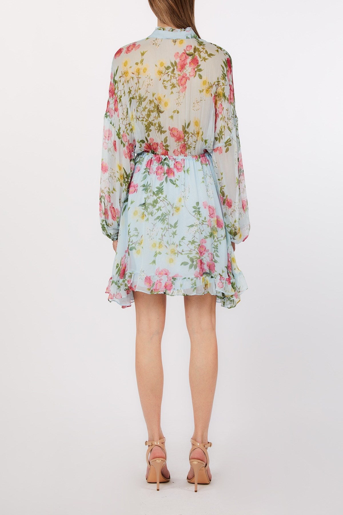 Romantique sans effort, cette mini-robe en mousseline flotte avec ses volants doux et son imprimé floral de rêve qui évoque le printemps en mouvement. La taille cintrée et le corsage délicatement boutonné lui confèrent une silhouette flatteuse, tandis que les manches bouffantes ajoutent une touche éthérée. Parfaite pour les garden-parties, les escapades à la mer ou les promenades ensoleillées.