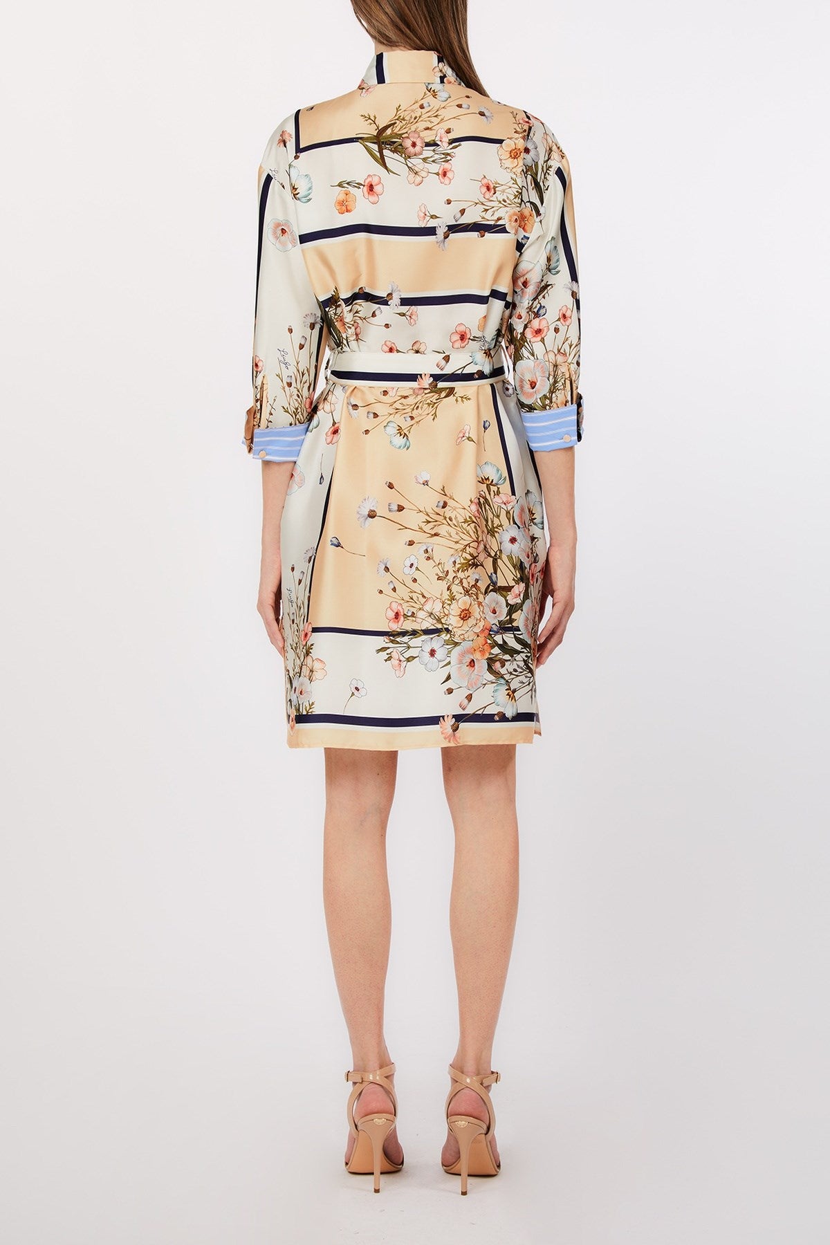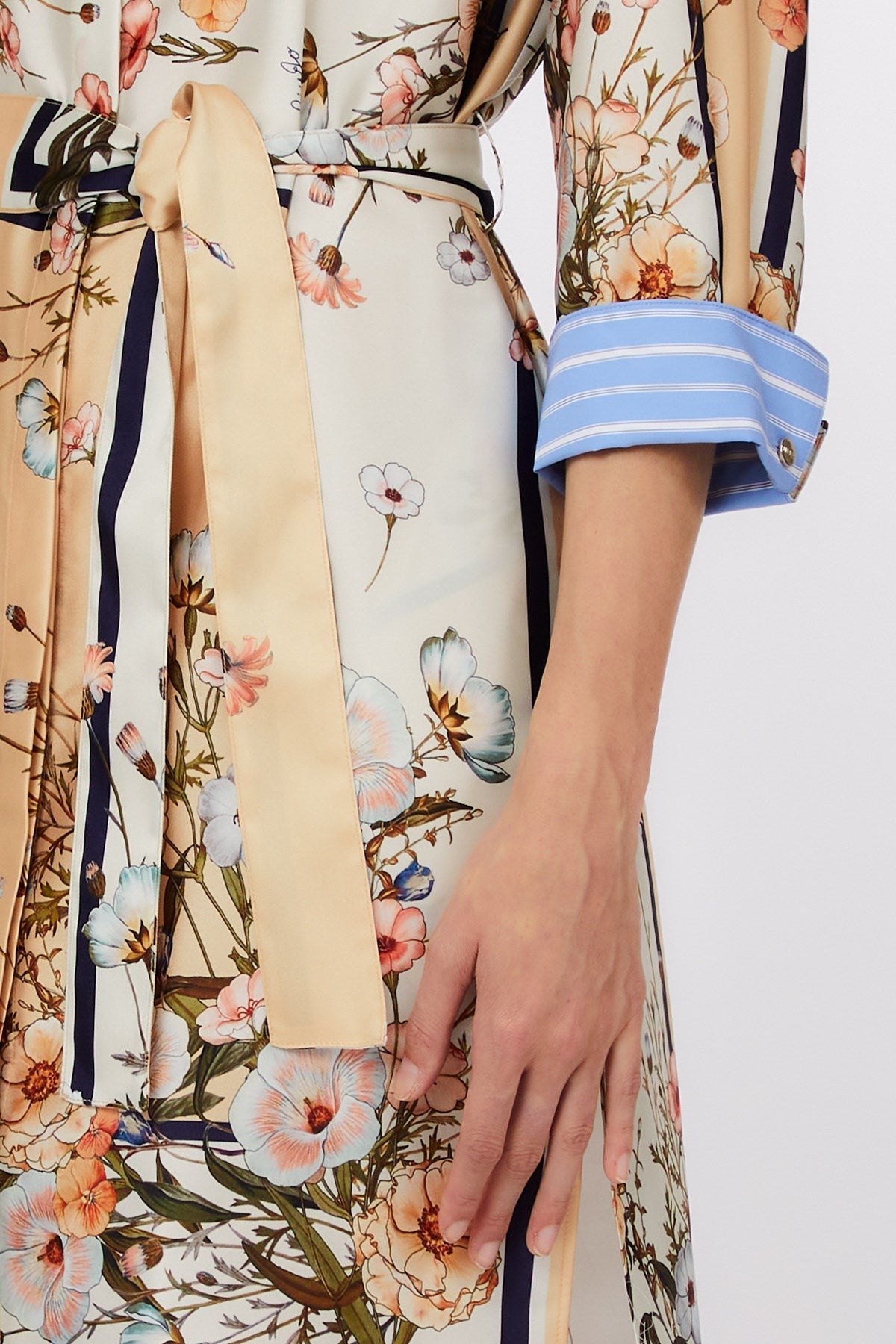 Alliant structure et douceur, cette robe chemise soyeuse est ornée d'un imprimé floral inspiré des foulards, encadré de bordures élégantes. La ceinture à nouer souligne la taille pour une silhouette flatteuse, tandis que les poignets roulés ajoutent une touche décontractée et moderne. Idéale pour passer du bureau au restaurant ou pour un look sophistiqué le week-end.