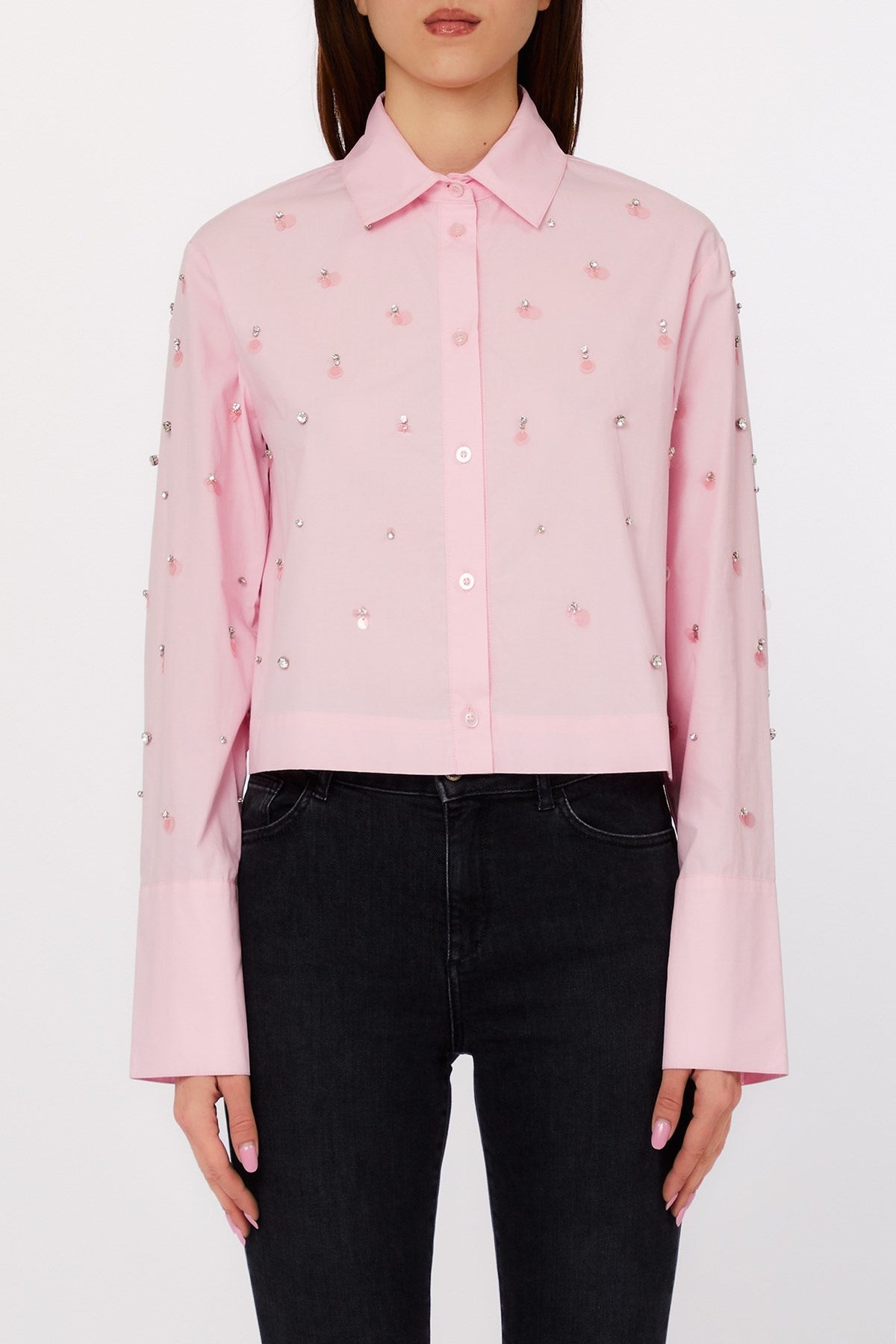Réinterprétation ludique d'une silhouette classique, cette chemise courte est ornée de pierres précieuses dispersées et de délicates applications de paillettes pour une touche d'éclat. Les larges poignets et le col impeccable équilibrent son charme avec une sophistication sur mesure. Idéale pour habiller un jean ou ajouter du style à une jupe élégante.