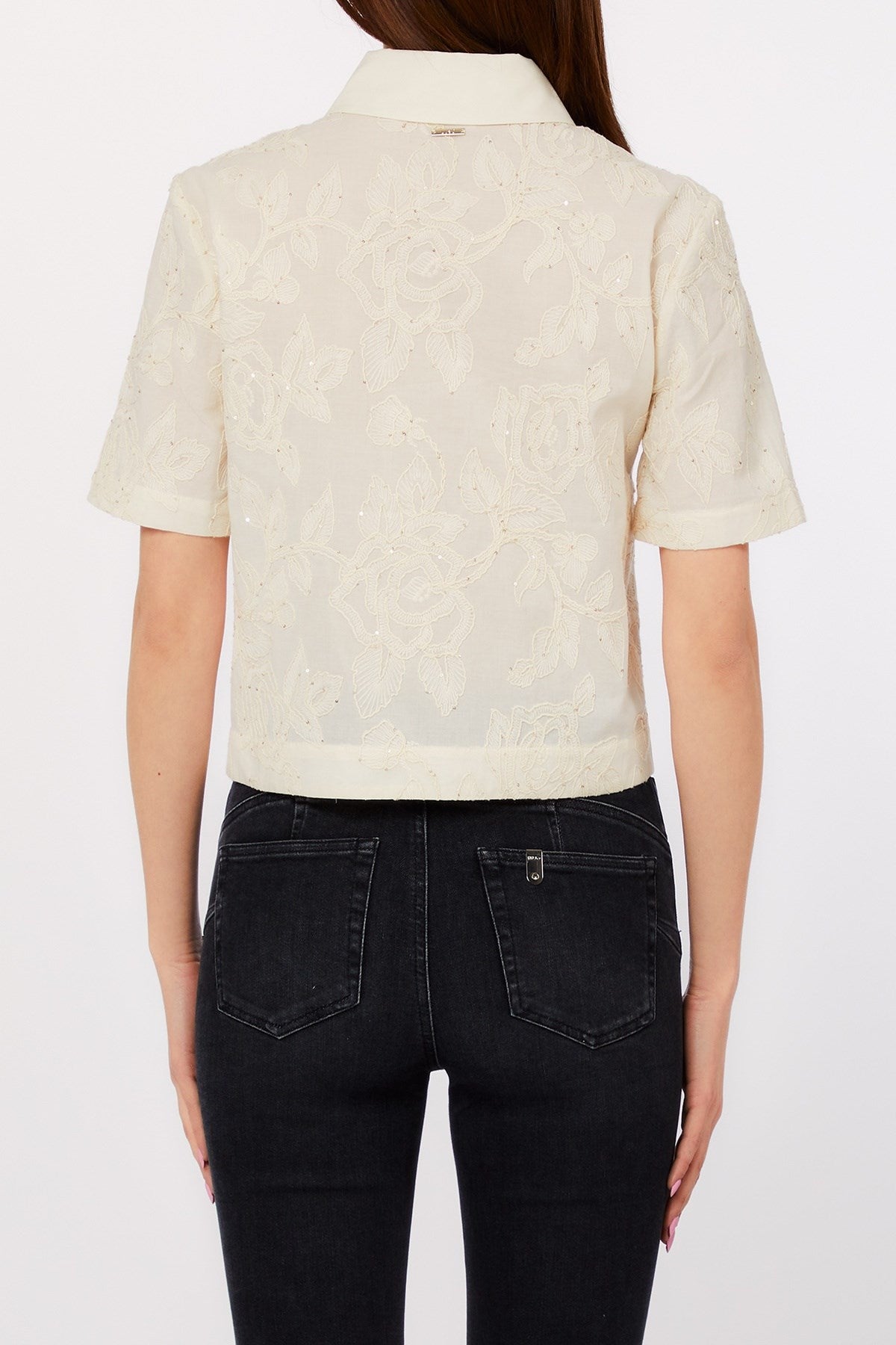 Délicate et ludique, cette blouse courte est ornée d'un motif floral en paillettes qui capte la lumière et scintille subtilement. L'ourlet festonné et le col épuré ajoutent de la structure à la texture romantique, tandis que les manches courtes lui confèrent une touche de fraîcheur et la rendent facile à porter. Un mélange charmant d'élégance et de fantaisie, parfait pour une tenue de jour raffinée ou une soirée habillée.