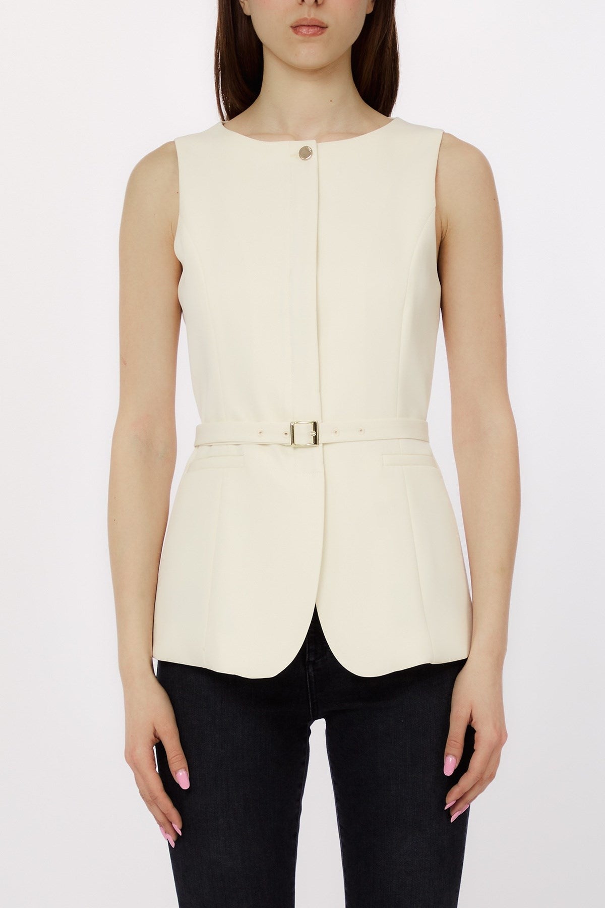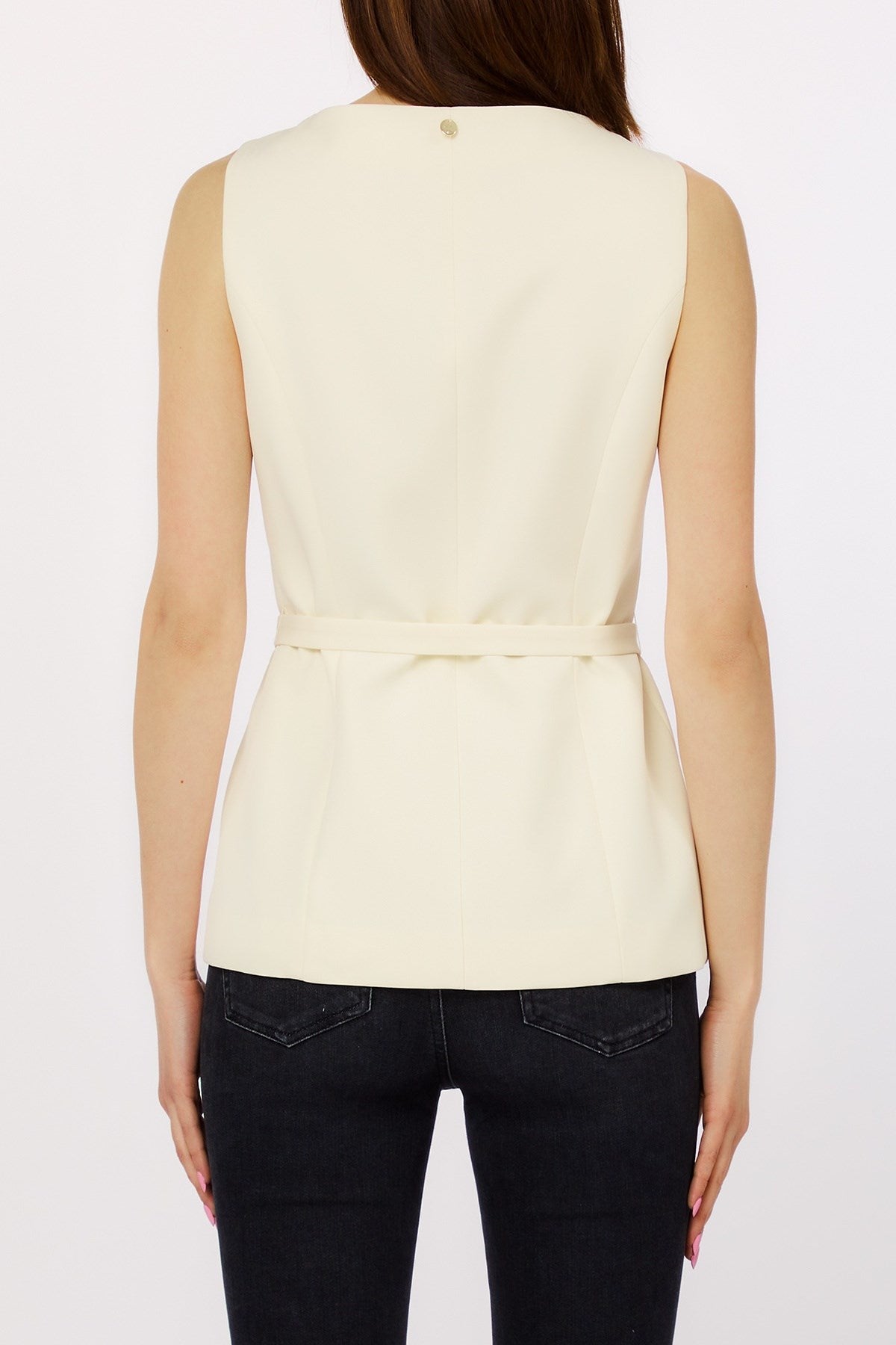 Conçue pour une coupe parfaite, cette veste sans manches présente des lignes épurées et une silhouette sculptée, soulignée par une ceinture ton sur ton élégante. Une patte de boutonnage dissimulée et un ourlet arrondi à l'avant ajoutent une touche raffinée, en faisant un incontournable sophistiqué pour les superpositions modernes. Discrète mais puissante, c'est une pièce intemporelle qui inspire une confiance tranquille.