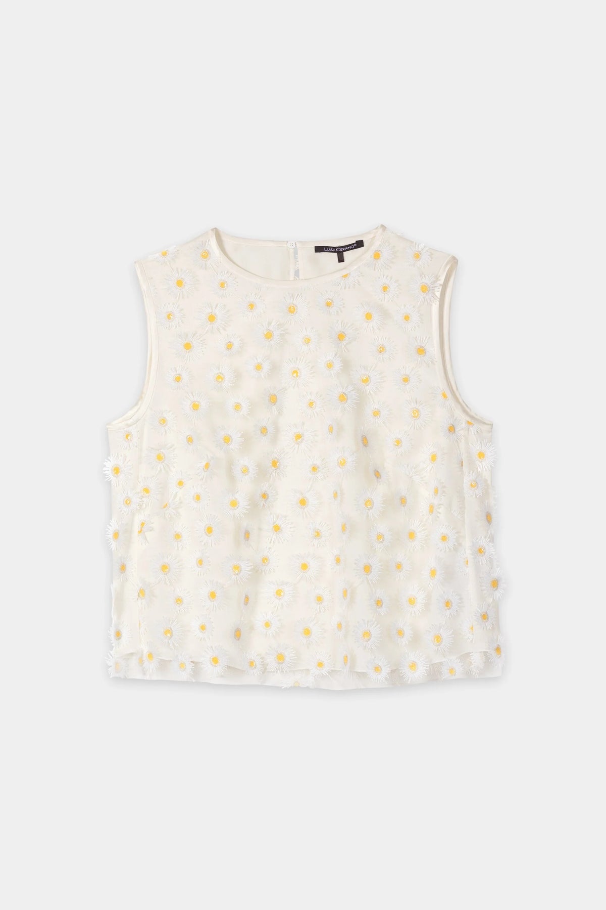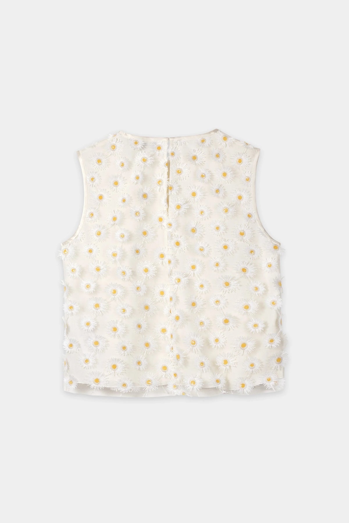 Frais et féminin, ce haut sans manches arbore un imprimé de marguerites éparpillées qui apporte un charme naturel à toutes vos tenues. Avec sa silhouette légèrement évasée et sa délicate ouverture dans le dos, il vous accompagne avec élégance du matin au soir. Une pièce légère qui respire l'élégance décontractée et le charme des journées ensoleillées.