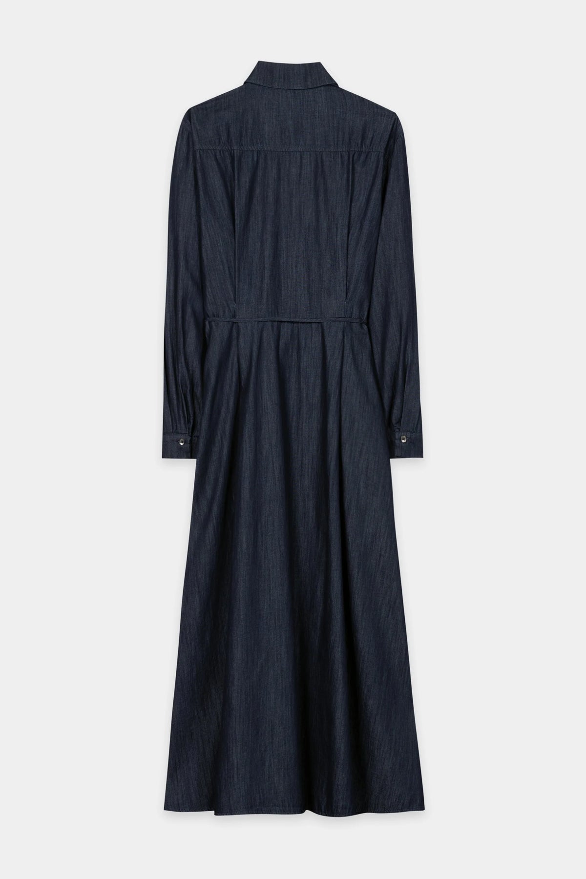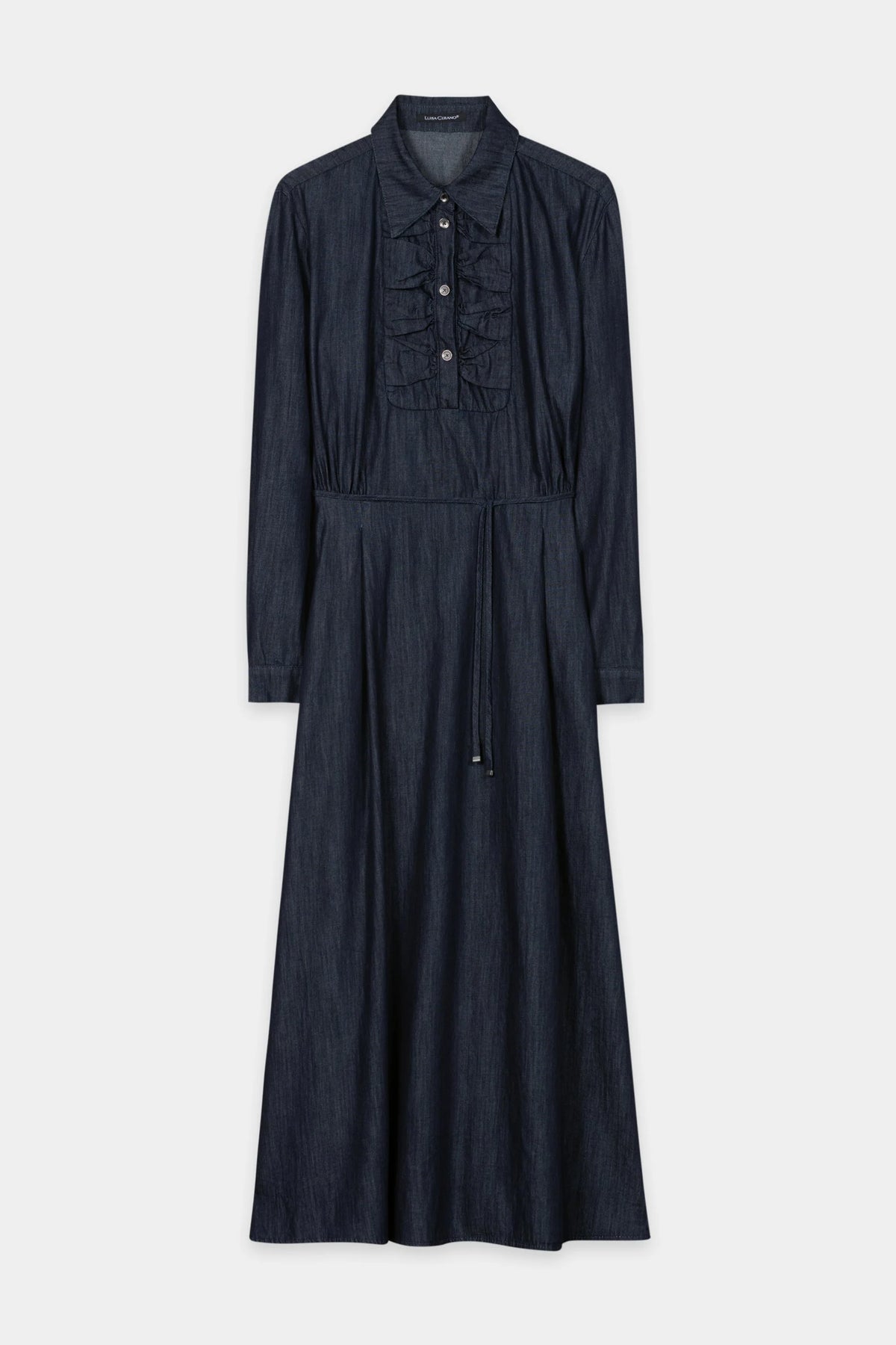 Cette robe mi-longue revisite le denim avec une touche de sophistication tout en douceur, grâce à ses volants romantiques au niveau de la patte de boutonnage et à son col en pointe qui lui confèrent un style d'inspiration vintage. Le cordon de serrage à la taille souligne délicatement la silhouette, créant un look flatteur au charme naturel. Une pièce polyvalente qui vous accompagne avec élégance du matin au soir.