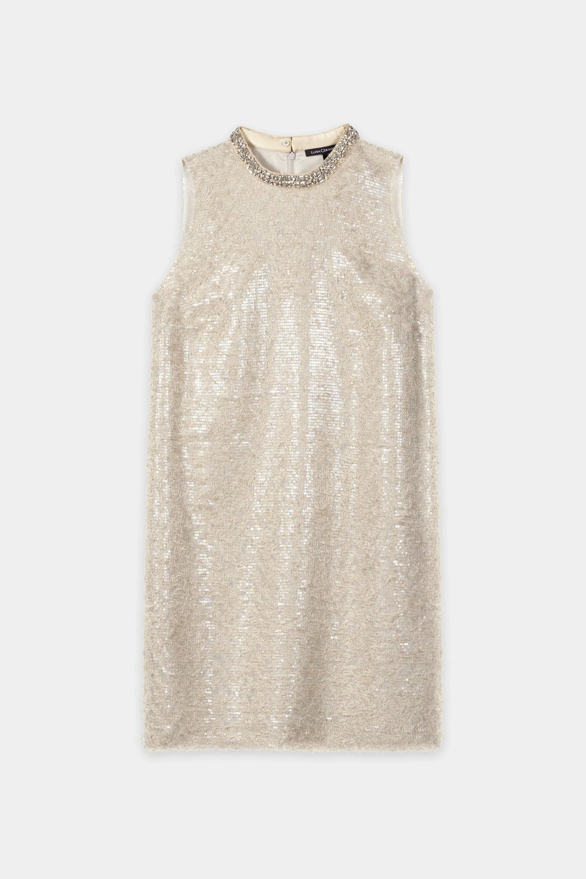 Minimaliste et raffinée, cette robe droite sans manches présente une silhouette épurée en A qui tombe naturellement depuis les épaules. Une touche de brillance orne l'encolure, ajoutant une touche de sophistication subtile à son design sobre. Agrémentée d'une délicate fente dans le dos et d'une fermeture à boutons, elle incarne l'élégance discrète.