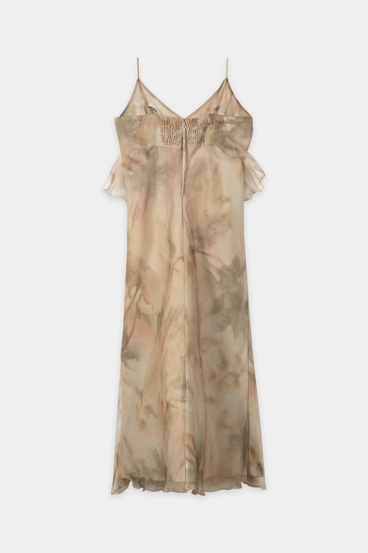 Romantique et d'une élégance naturelle, cette robe longue se distingue par ses volants virevoltants le long des fines bretelles et par son corsage aux lignes douces. Le dos séduit par son délicat empiècement smocké et son nœud, alliant charme et confort. Se terminant par un ourlet légèrement évasé, c'est la pièce idéale pour les soirées chaudes et les journées ensoleillées.
