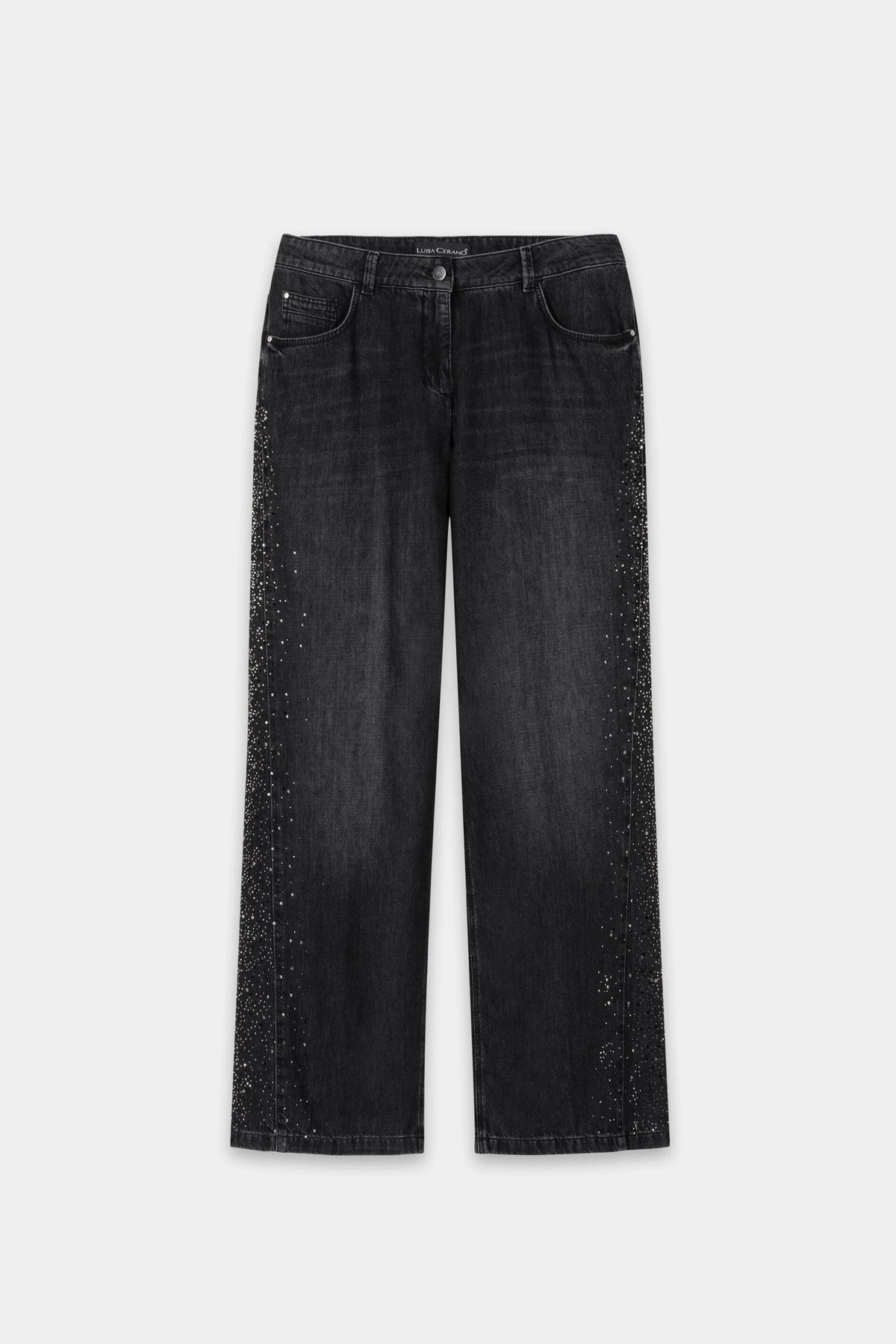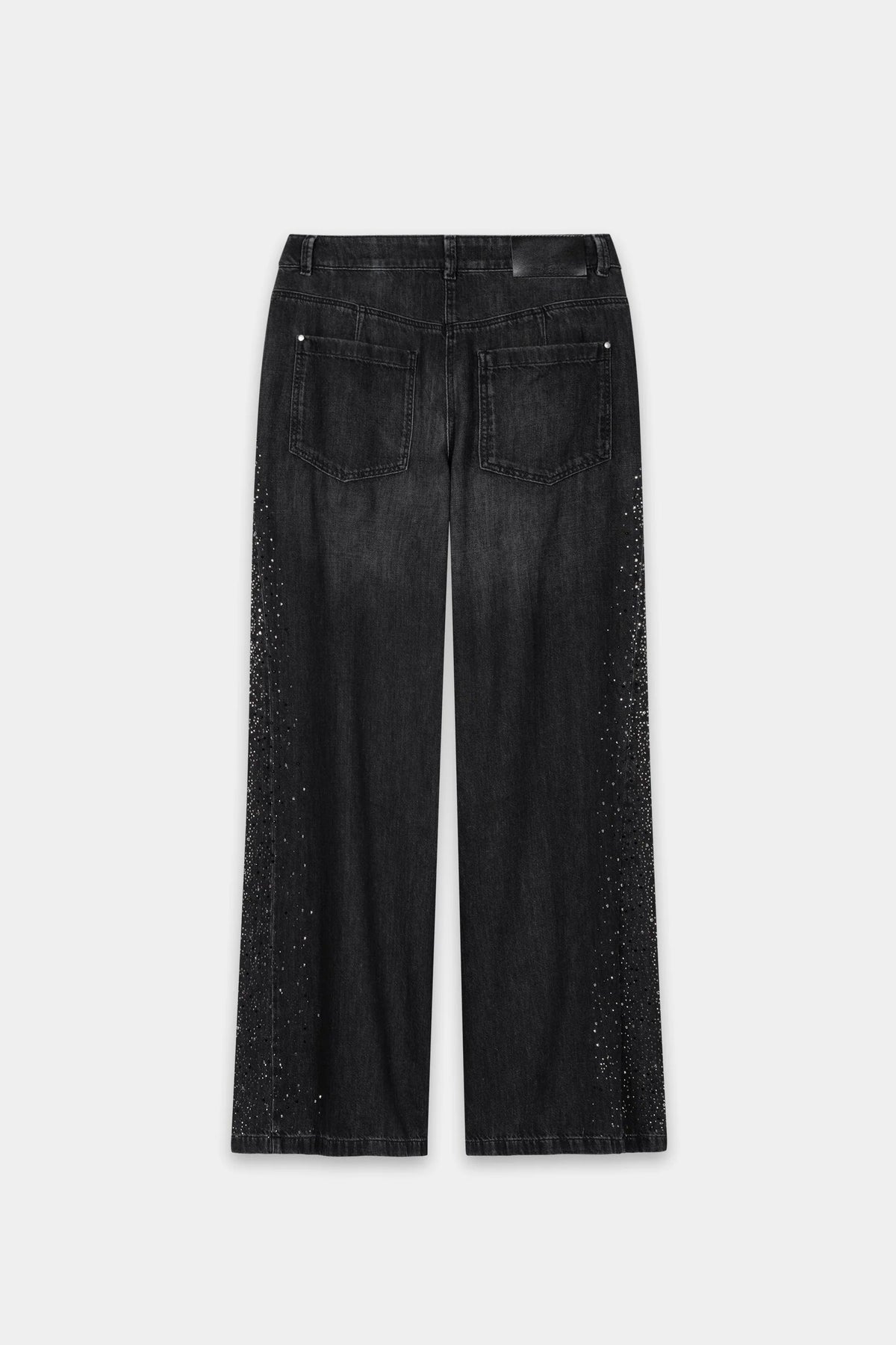Le glamour rencontre l'audace dans ce jean à jambes larges, orné d'une constellation d'embellissements scintillants qui descendent en cascade le long des coutures latérales. La coupe classique à cinq poches et la taille haute offrent une silhouette flatteuse, tandis que les reflets brillants ajoutent une touche dramatique instantanée. Parfait pour les sorties nocturnes ou les tenues audacieuses en journée, il redéfinit le denim avec une touche éblouissante.