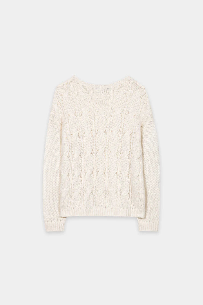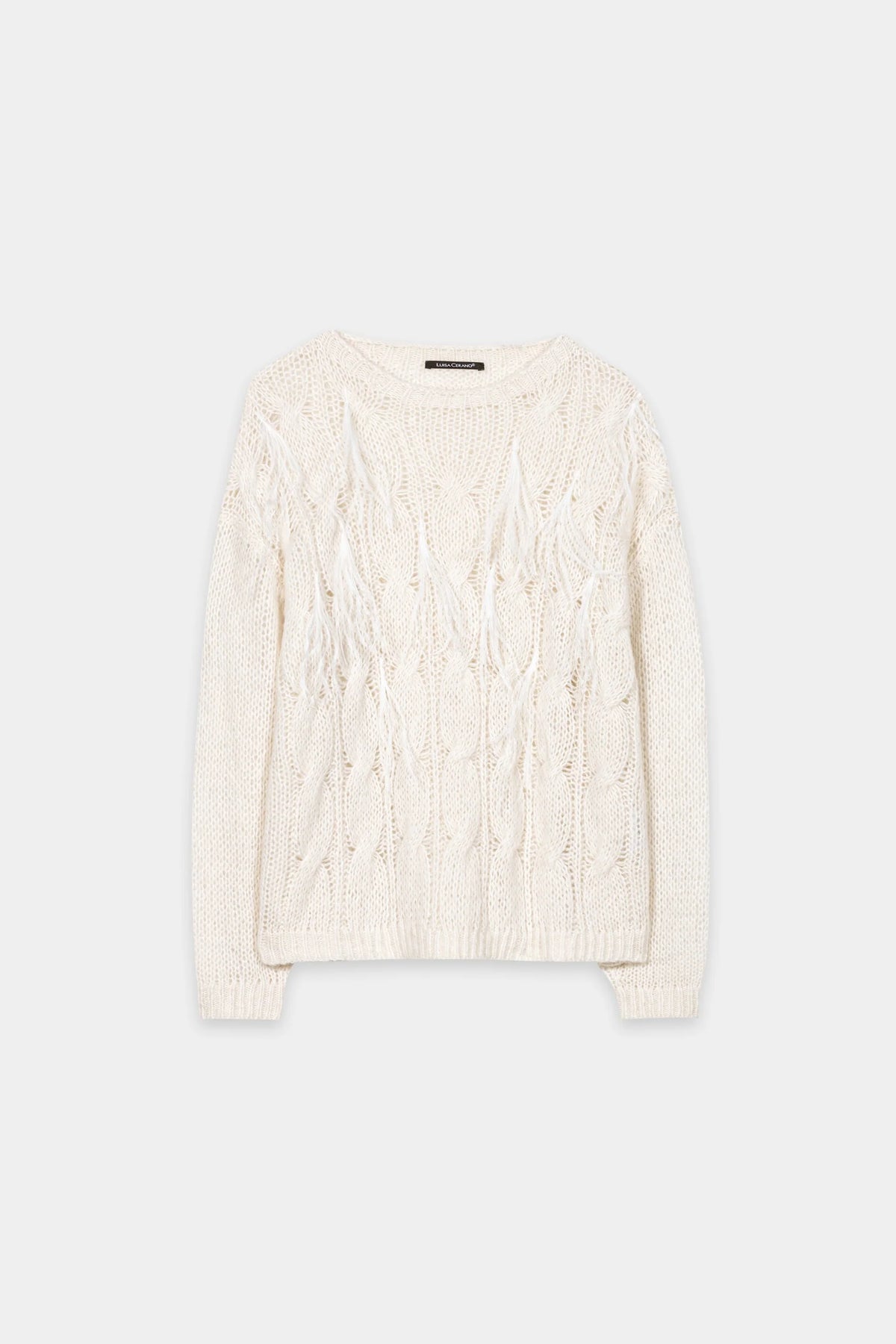 Variante ludique d'un tricot torsadé intemporel, ce pull donne vie à la texture grâce à ses franges subtiles. Son aspect confortable et épais est parfait pour les journées fraîches, tandis que son design complexe ajoute un charme artisanal. Une pièce remarquable qui ne crie pas, mais murmure simplement le style.