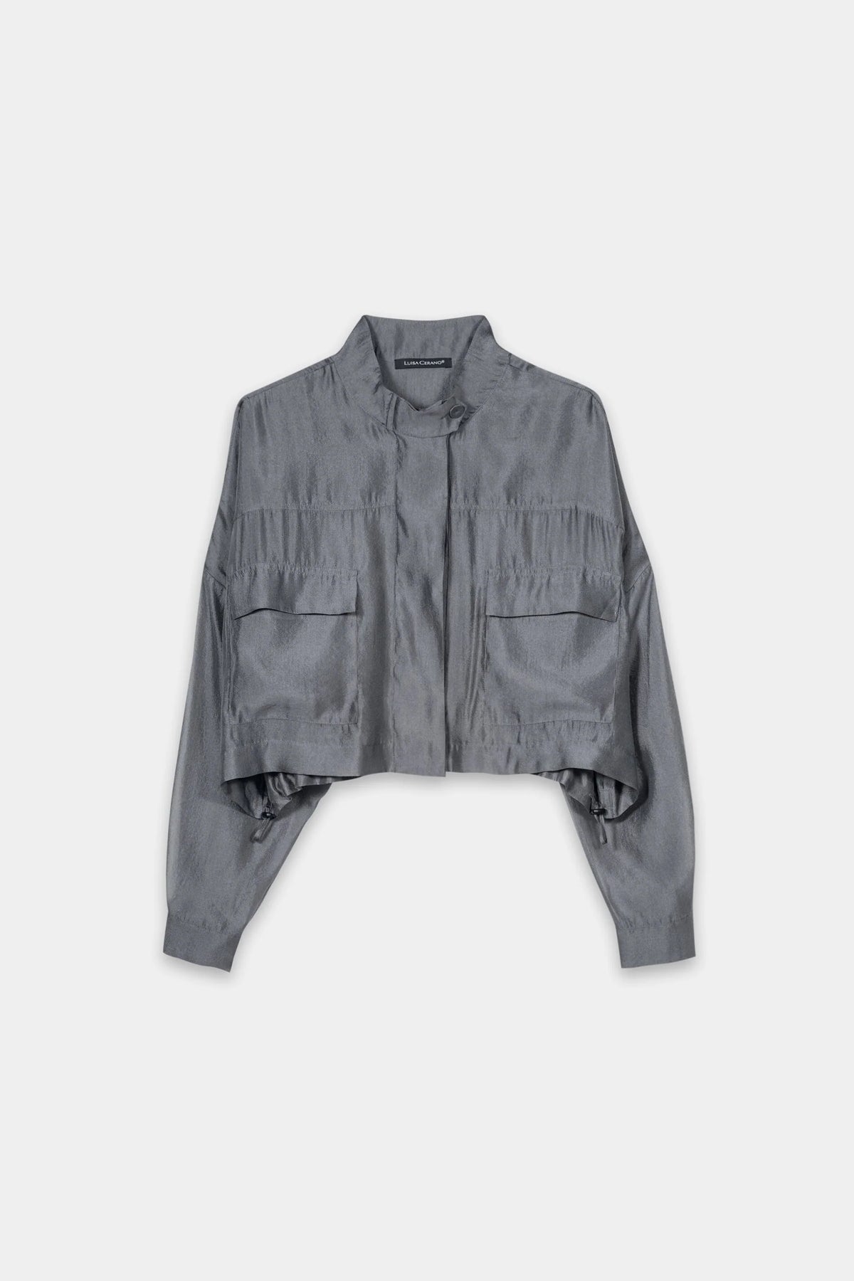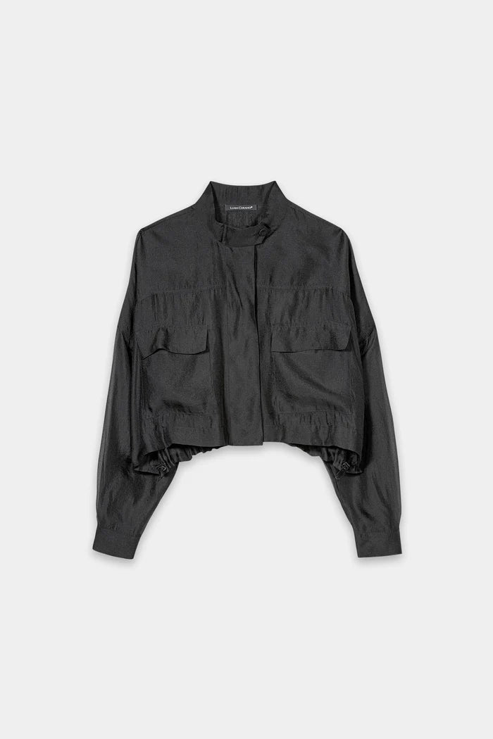 Cette veste utilitaire courte, naturellement tendance, présente une silhouette décontractée avec des poches à rabat oversize et un ourlet froncé pour plus de forme. L'encolure haute et la patte de boutonnage dissimulée lui confèrent une touche minimaliste. Une pièce incontournable à superposer qui allie fonctionnalité et style raffiné.
