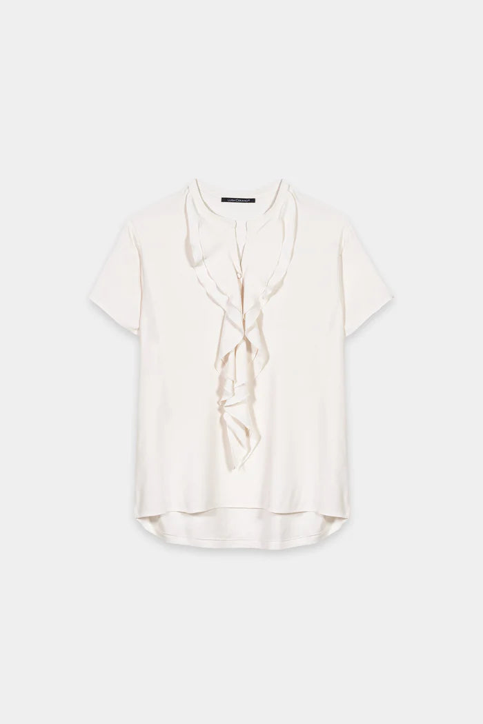 Délicatement fluide, cette blouse séduit par son encolure à volants en cascade qui lui confère un mouvement doux et une élégance raffinée. Son tissu léger et ses manches courtes en font un choix à la fois léger et raffiné, idéal pour le bureau ou les occasions spéciales. Une façon simple d'ajouter une touche romantique à n'importe quel look.