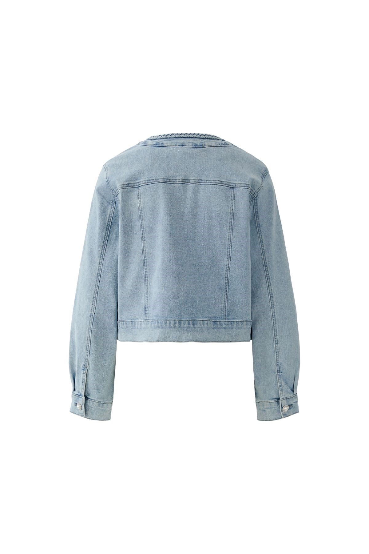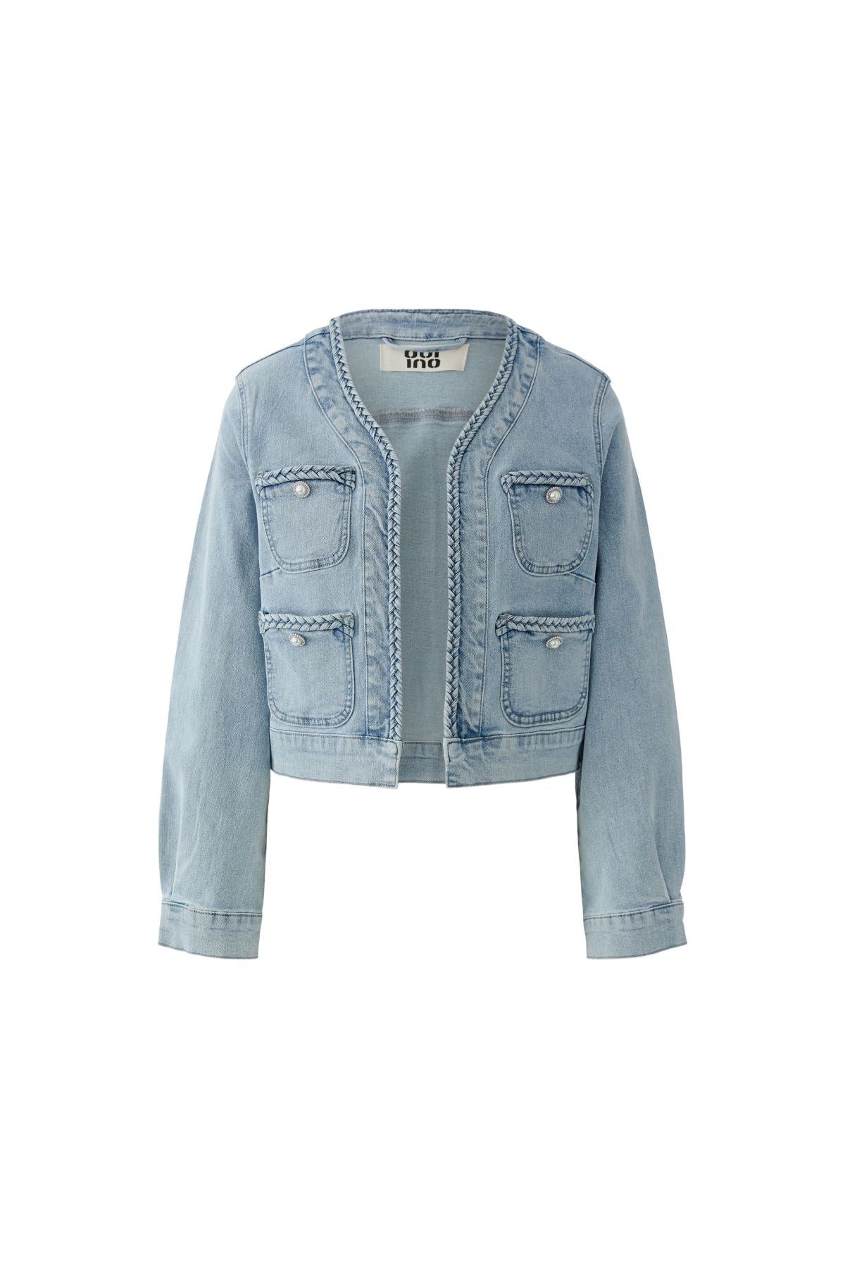 Réinterprétation moderne d'un classique intemporel, cette veste en jean courte allie l'élégance parisienne à un style décontracté. Les bordures tressées et les poches ornées de perles ajoutent une touche d'élégance à sa silhouette structurée. Le mélange parfait entre style cool et raffinement pour des superpositions faciles au quotidien.