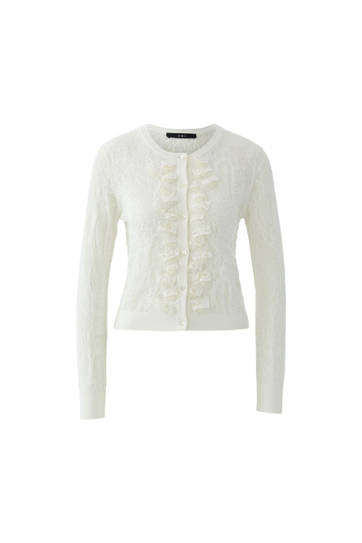 Délicatement féminin, ce cardigan en dentelle est orné de volants délicats le long de la patte de boutonnage, pour une touche de charme vintage. Sa silhouette ajustée et sa texture complexe en font une pièce gracieuse à porter par-dessus une robe ou un caraco. Romantique, raffiné et naturellement élégant.