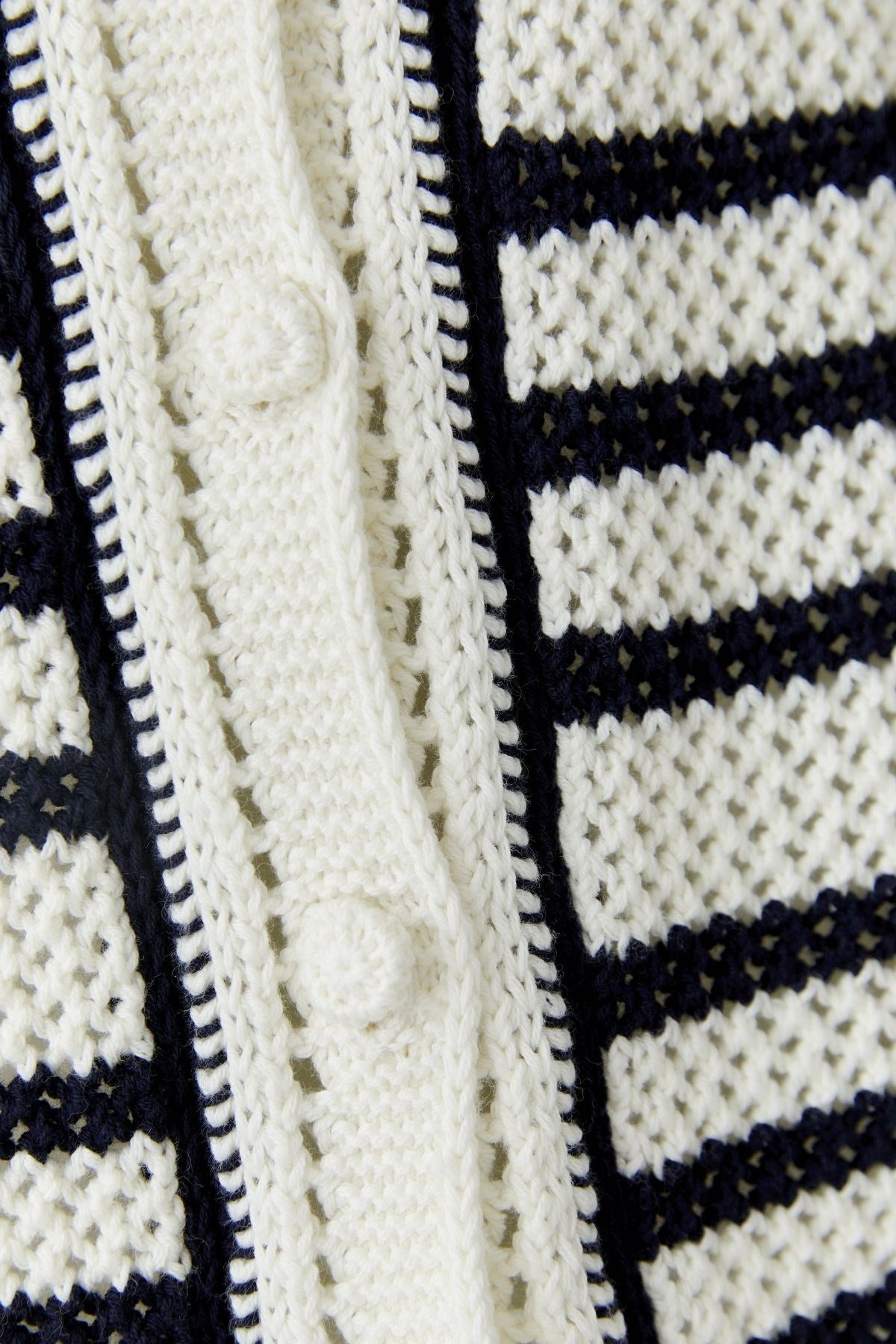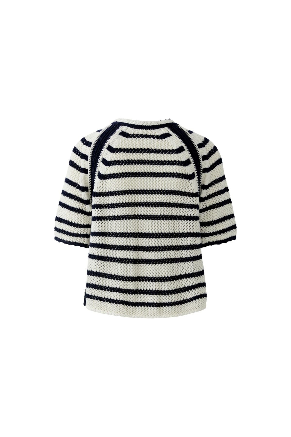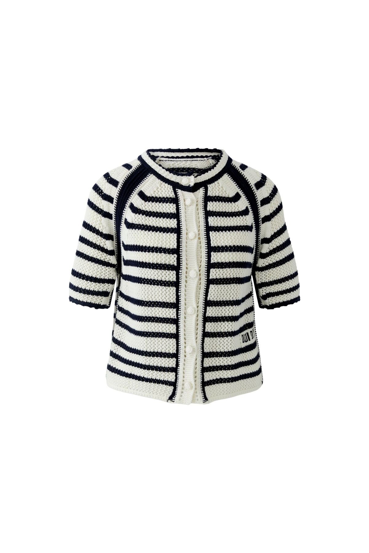 Charmant et nautique, avec un aspect artisanal, ce cardigan à manches courtes présente des rayures horizontales audacieuses et des détails en maille texturée. L'encolure arrondie et les boutons ton sur ton ajoutent une touche d'inspiration vintage, tandis que la broderie « OUI OUI » lui confère une touche ludique. Une pièce légère à superposer, au charme intemporel.