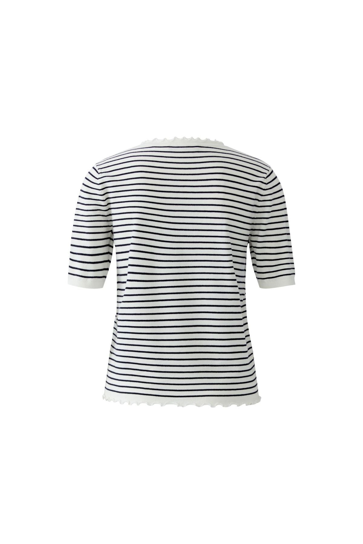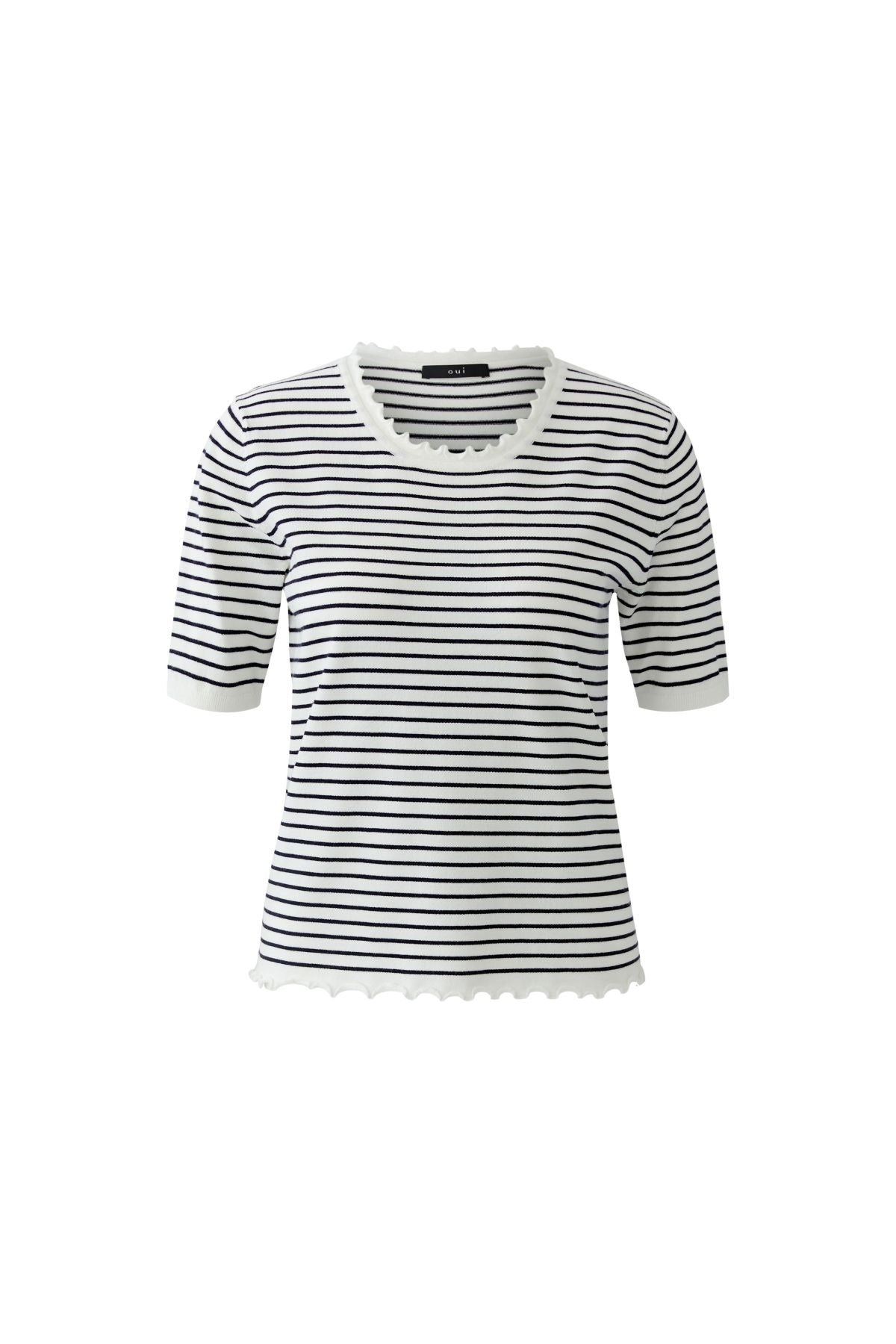 Frais et féminin, ce t-shirt en maille rayée est orné de délicats bords festonnés à l'encolure, aux manches et à l'ourlet. Sa silhouette ajustée ajoute une touche d'élégance à son charme espiègle. Un basique adorable qui égaye tous les looks décontractés.