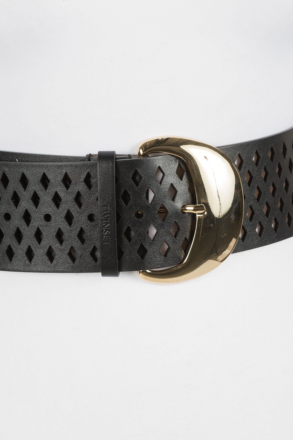 Audacieuse et sculpturale, cette large ceinture se distingue par ses perforations en forme de losanges et sa boucle surdimensionnée étincelante. Sa coupe structurée souligne la taille avec assurance, apportant instantanément une touche d'originalité aux robes fluides ou aux blazers ajustés. Un classique moderne au charme irrésistible.