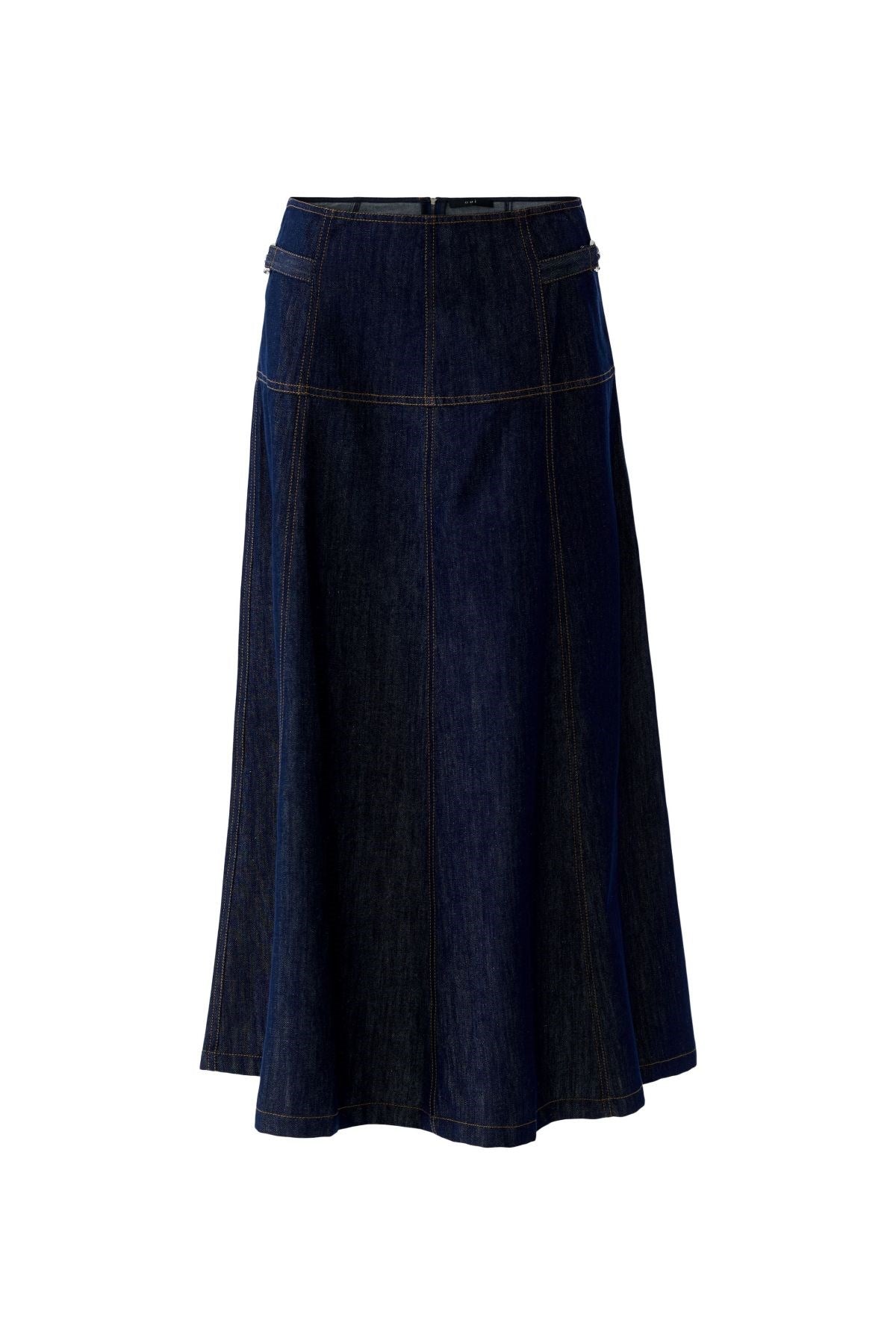 Intemporelle et raffinée, cette jupe en denim évasée présente une structure souple et un volume subtil. Sa construction à empiècements et ses surpiqûres contrastées lui confèrent un aspect ajusté, tandis que les pattes latérales ajoutent une touche de charme utilitaire. Une pièce polyvalente qui passe sans effort du style décontracté au style raffiné.