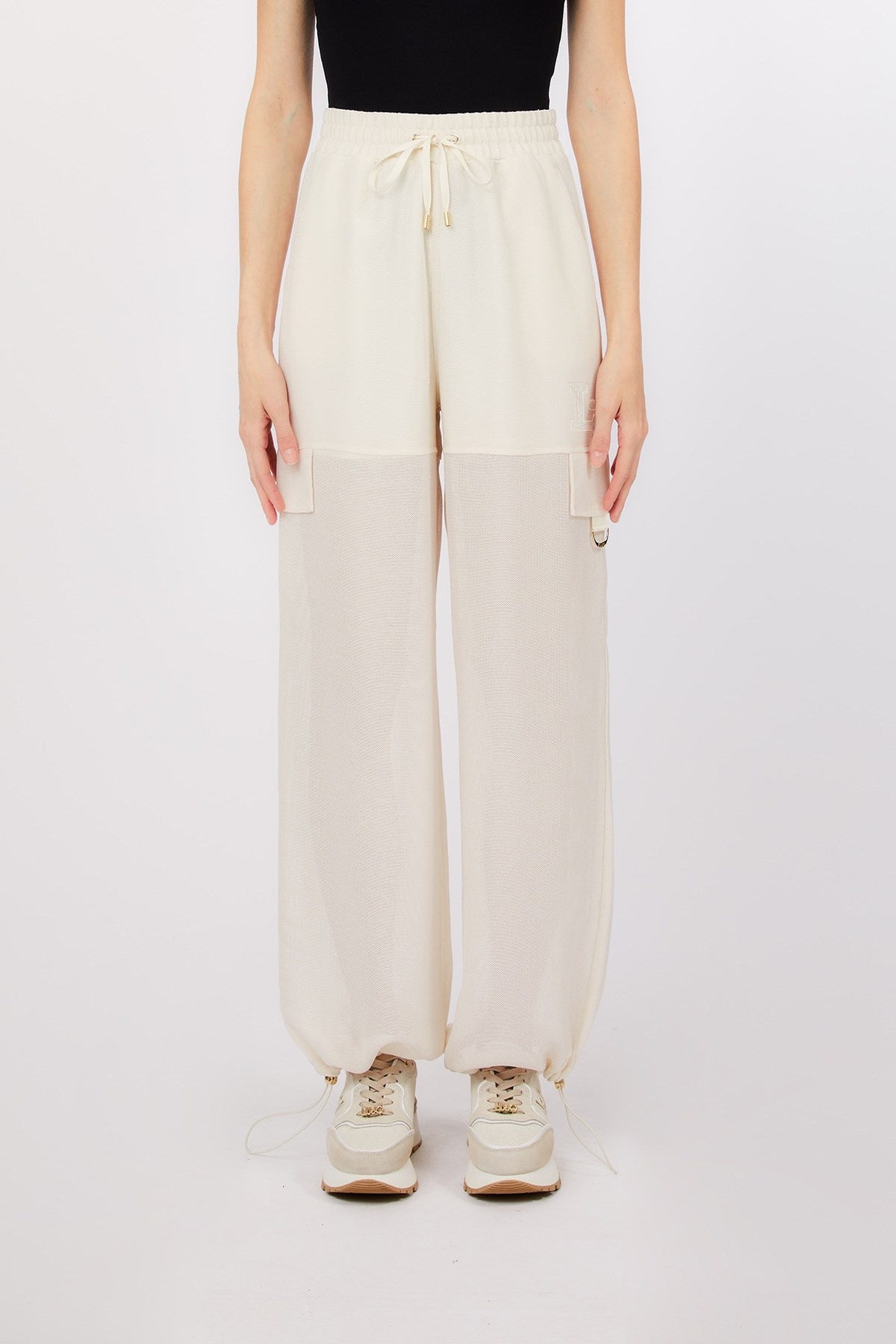 Légers et faciles à porter, ces pantalons de jogging à jambes larges présentent un empiècement semi-transparent contrasté qui ajoute un effet aérien et superposé. La taille à cordon et les poches de style cargo leur confèrent une touche sportive et fonctionnelle. Parfaits pour un look décontracté raffiné ou inspiré du streetwear.