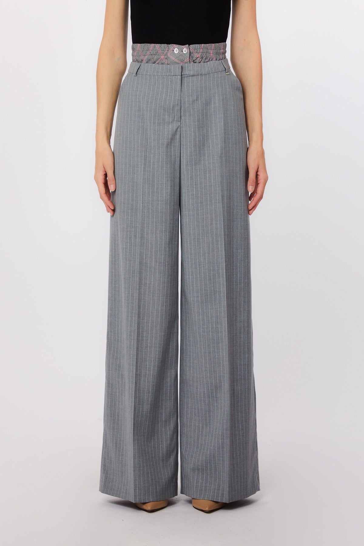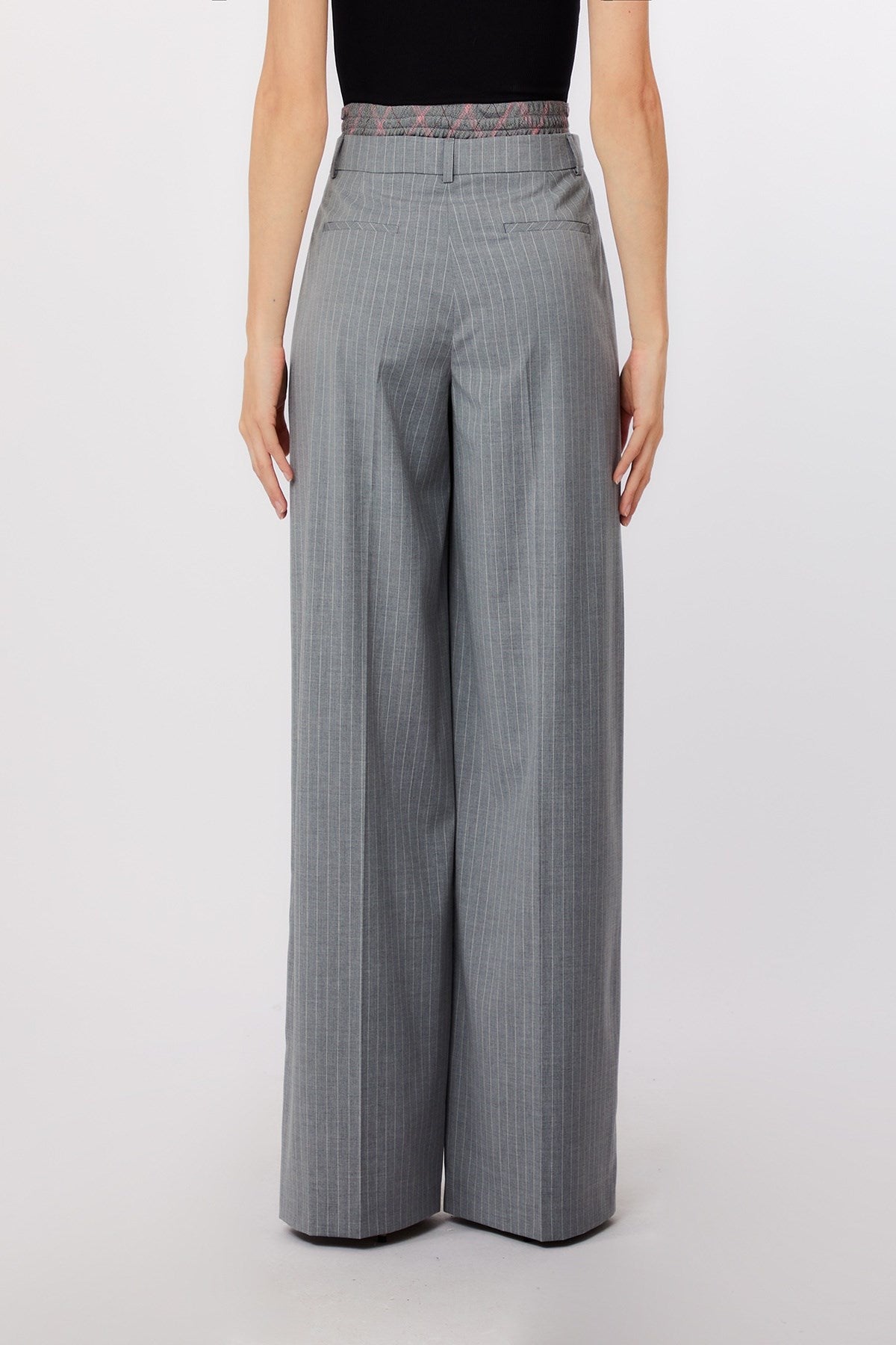Ce pantalon à jambes larges revisite avec audace la coupe classique grâce à ses rayures fines et sa ceinture contrastée inattendue. Le haut froncé et matelassé ajoute une touche de texture et une note moderne à une silhouette autrement raffinée. Sophistiqué et légèrement décontracté, il est fait pour se démarquer.