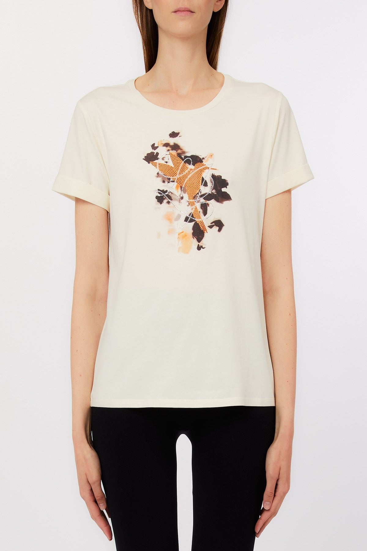 Délicat mais plein d'énergie, ce t-shirt arbore un colibri en plein vol orné de strass, sur un fond floral abstrait. Ses manches retroussées et son encolure ras du cou épurée lui confèrent un style décontracté et intemporel. Une touche subtile de brillance apporte un charme naturel à cet indispensable du quotidien.