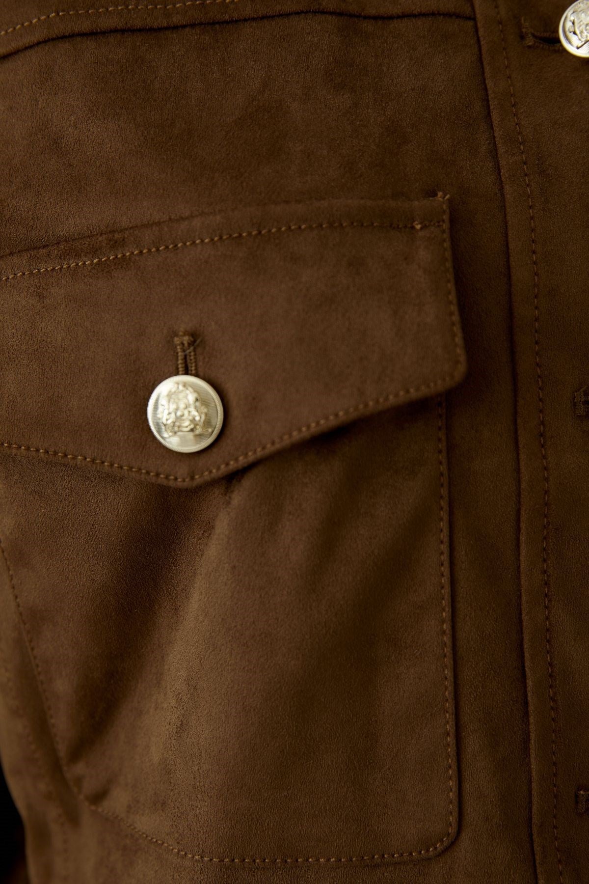 Élégante et structurée, avec une touche vintage, cette veste en daim synthétique apporte une texture luxueuse à une coupe utilitaire classique. Les boutons et les poches à rabat ajoutent une touche raffinée, tandis que la coupe courte lui confère un style moderne et polyvalent. Une pièce raffinée qui rehausse vos tenues de tous les jours.