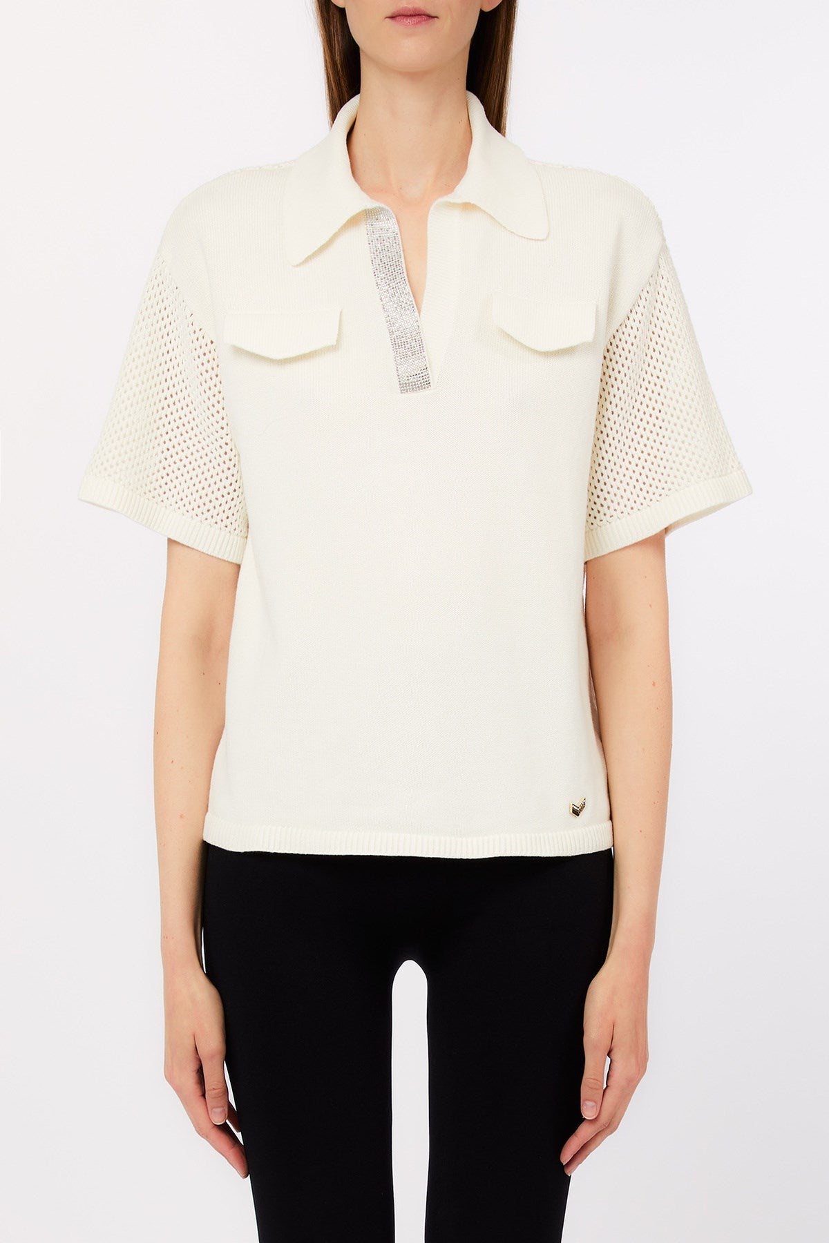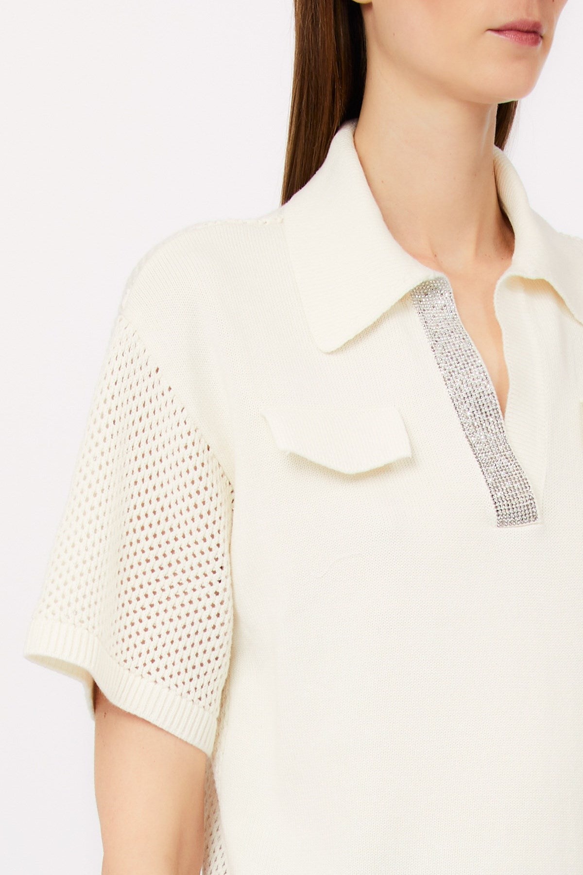 Ce haut sport chic en maille ajourée, avec ses manches en résille et son dos transparent, offre une sensation de légèreté et de fraîcheur. Ses poches à rabat et sa patte de boutonnage ornée de strass scintillants lui confèrent une touche glamour subtile. Une version moderne des vêtements décontractés, à la fois relaxante et raffinée.