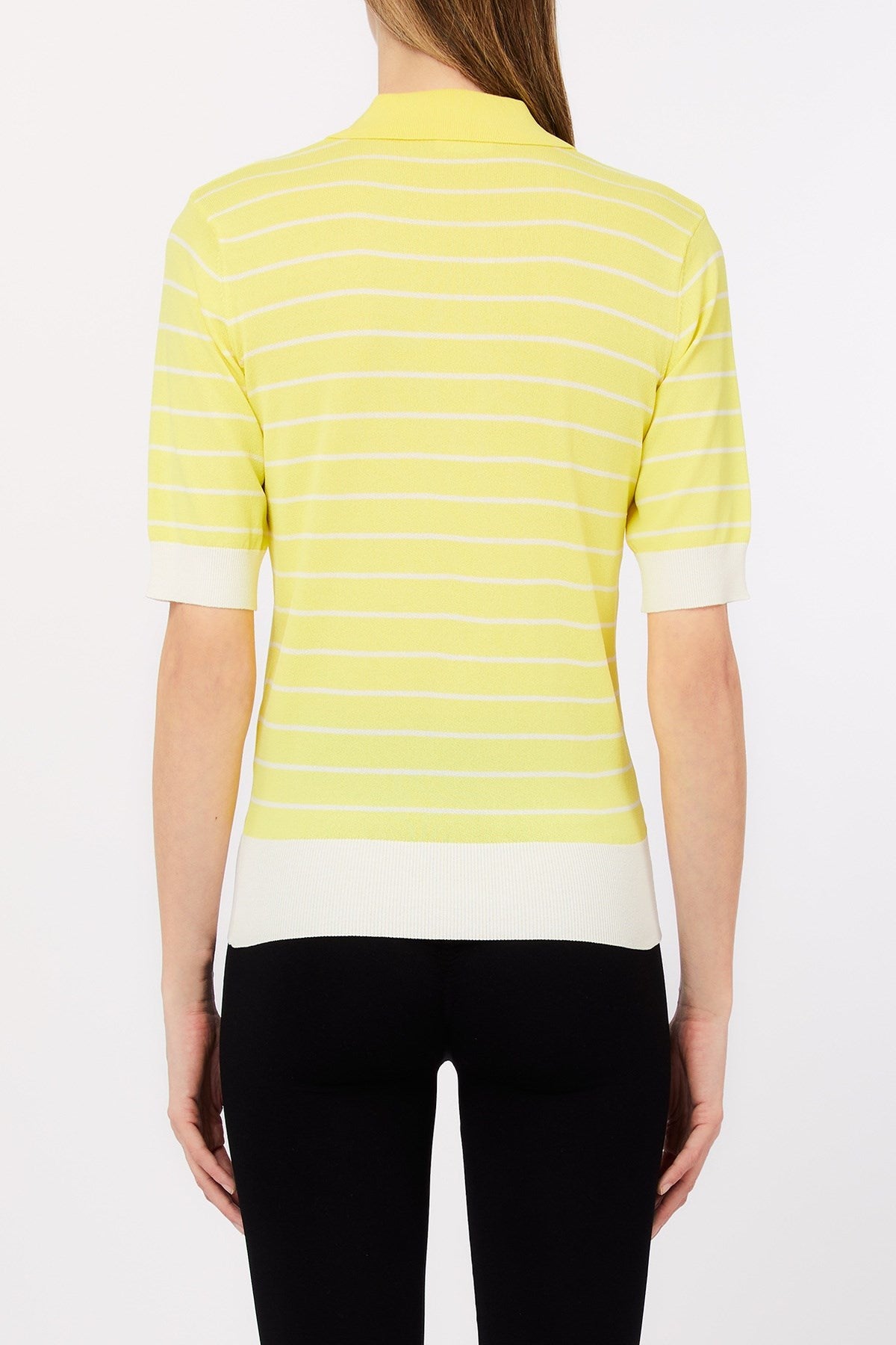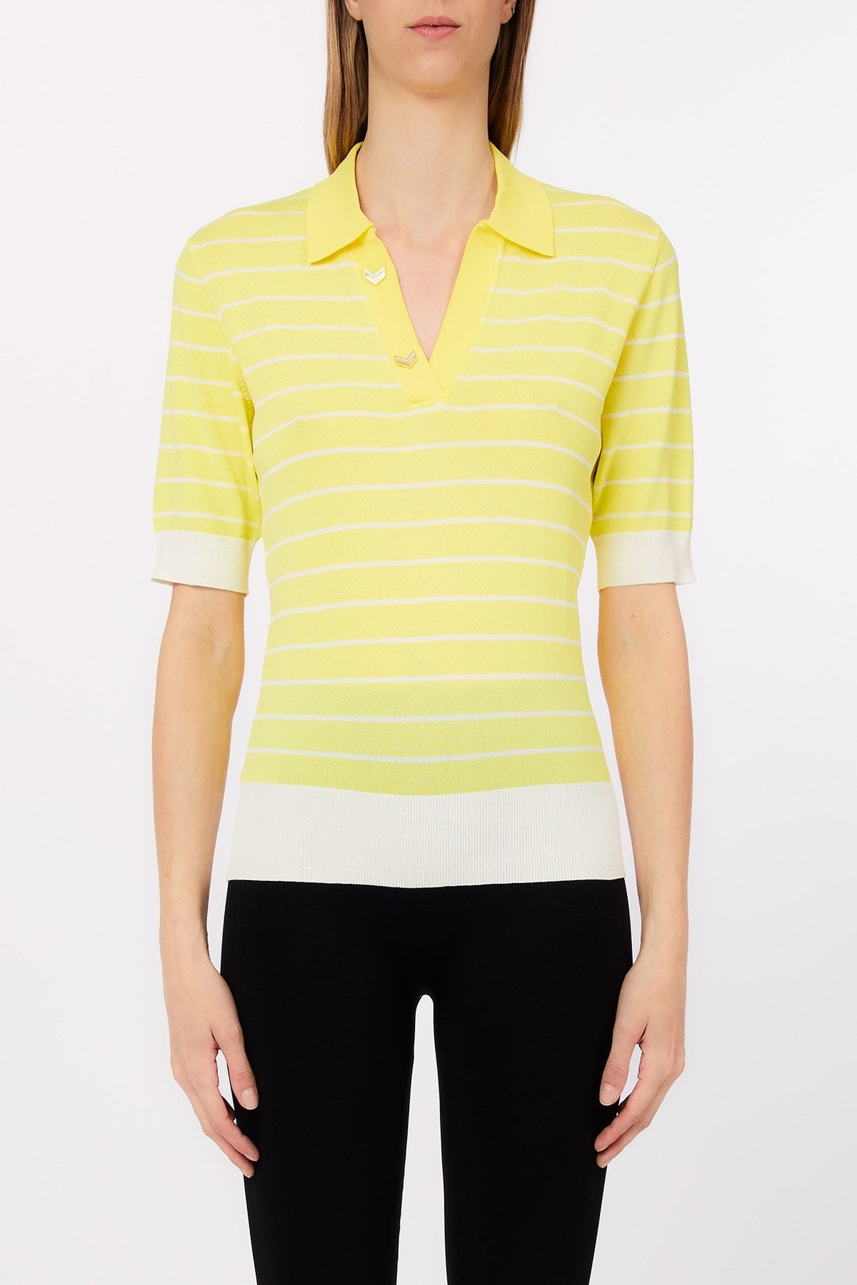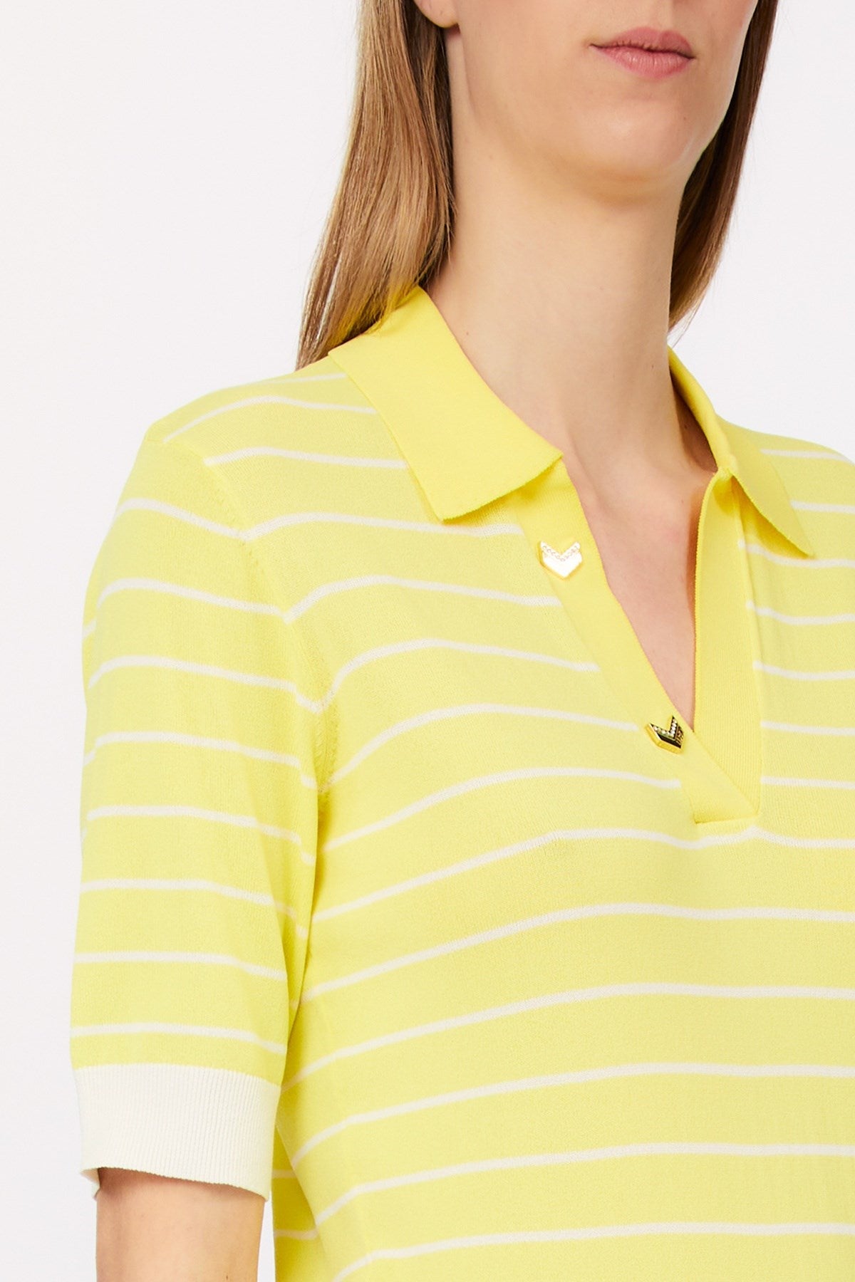 Classique avec une touche de fraîcheur, ce polo en tricot présente de fines rayures horizontales et un col en V profond orné de détails métalliques. Sa silhouette ajustée et son ourlet côtelé contrasté créent une forme élégante et flatteuse. Un basique raffiné qui allie charme sportif et élégance au quotidien.