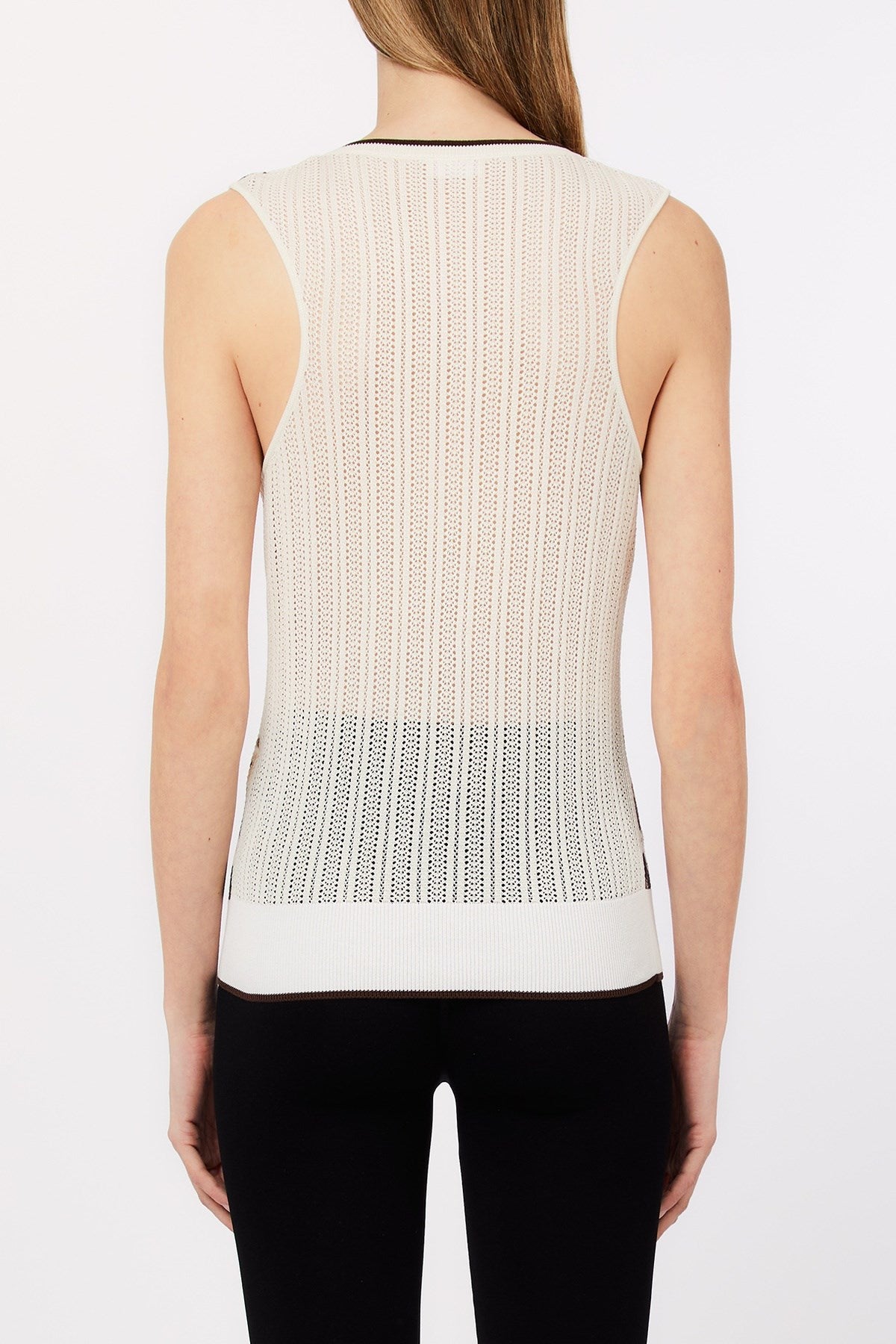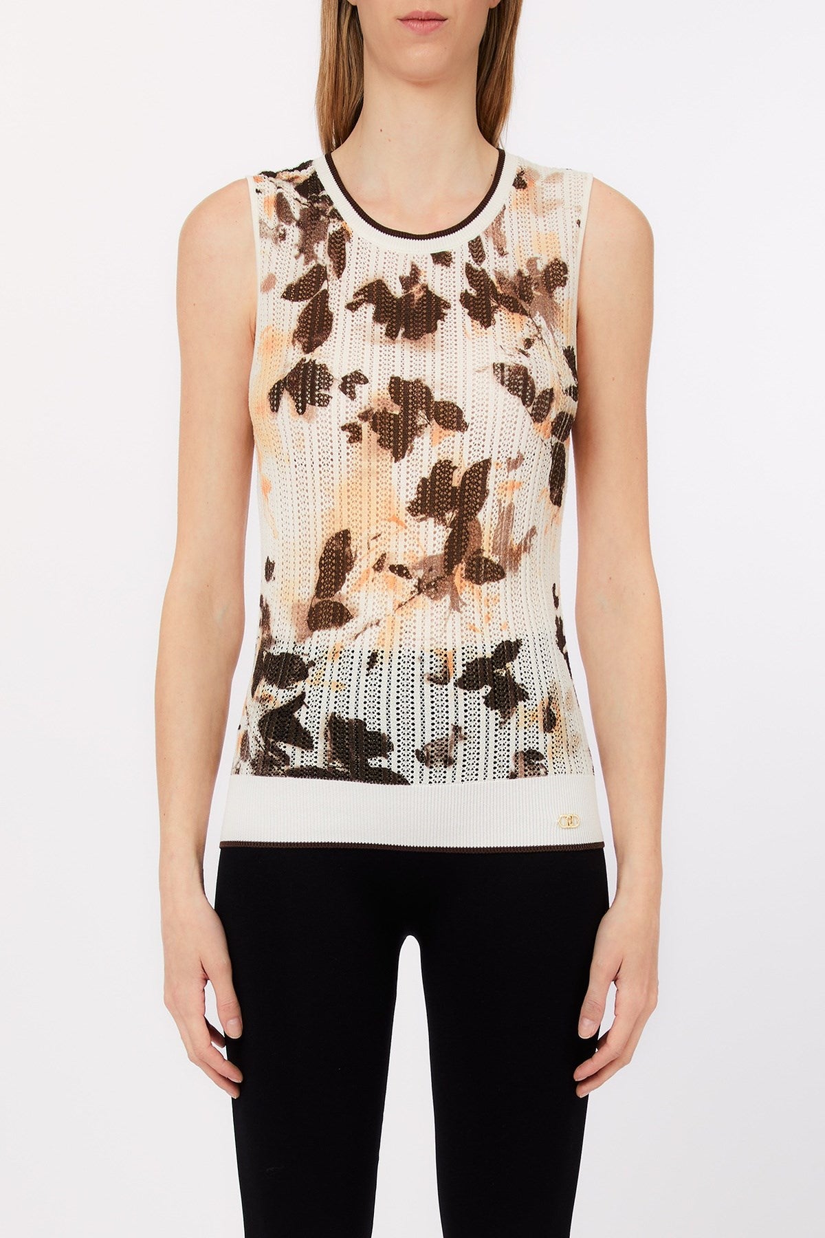 Délicat et contemporain, ce haut sans manches en maille présente une texture transparente et perforée, rehaussée d'un imprimé floral abstrait. Les bordures côtelées à l'encolure et à l'ourlet ajoutent du contraste et de la structure à la silhouette aérienne. Une pièce légère et originale, à la fois féminine et fraîche.