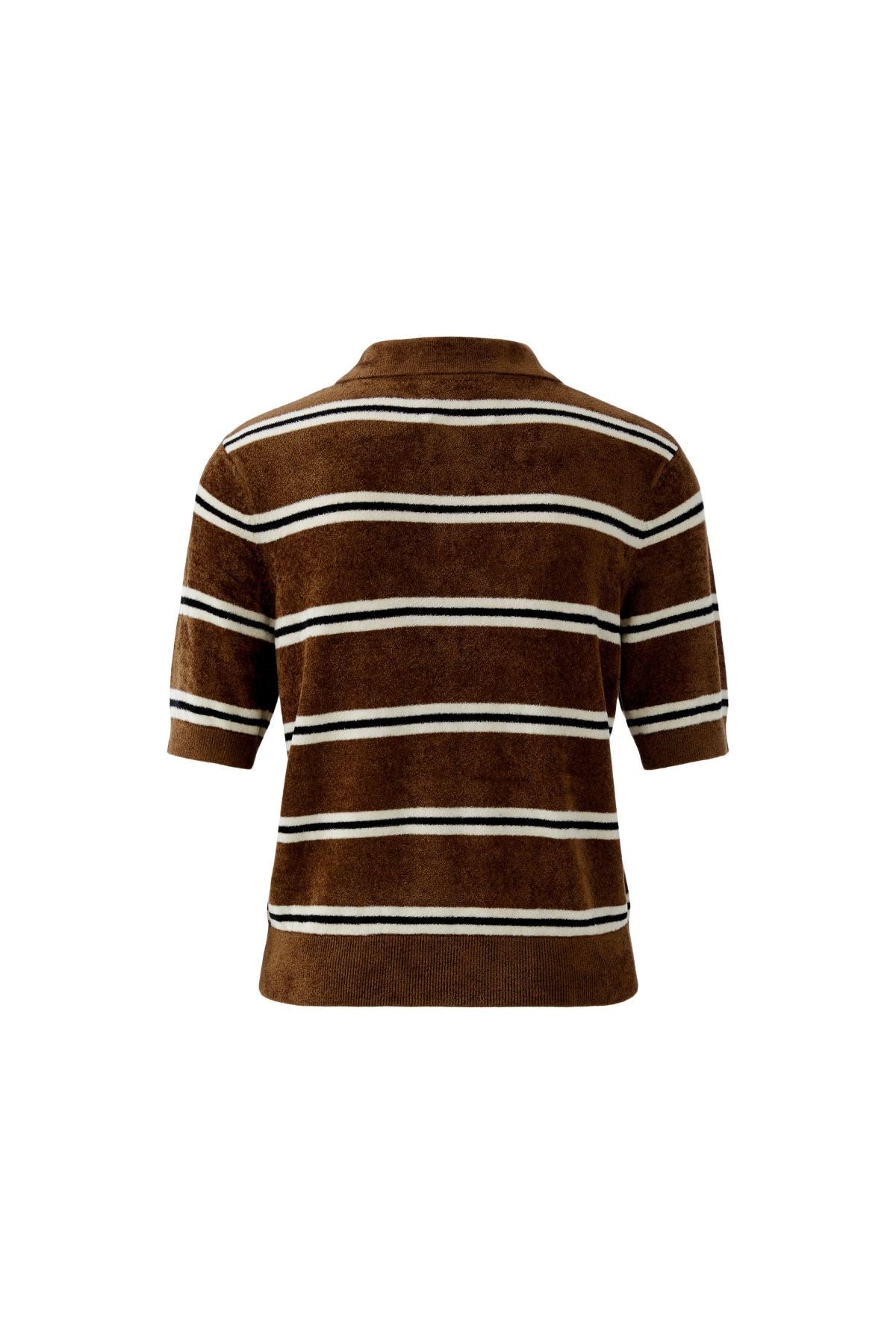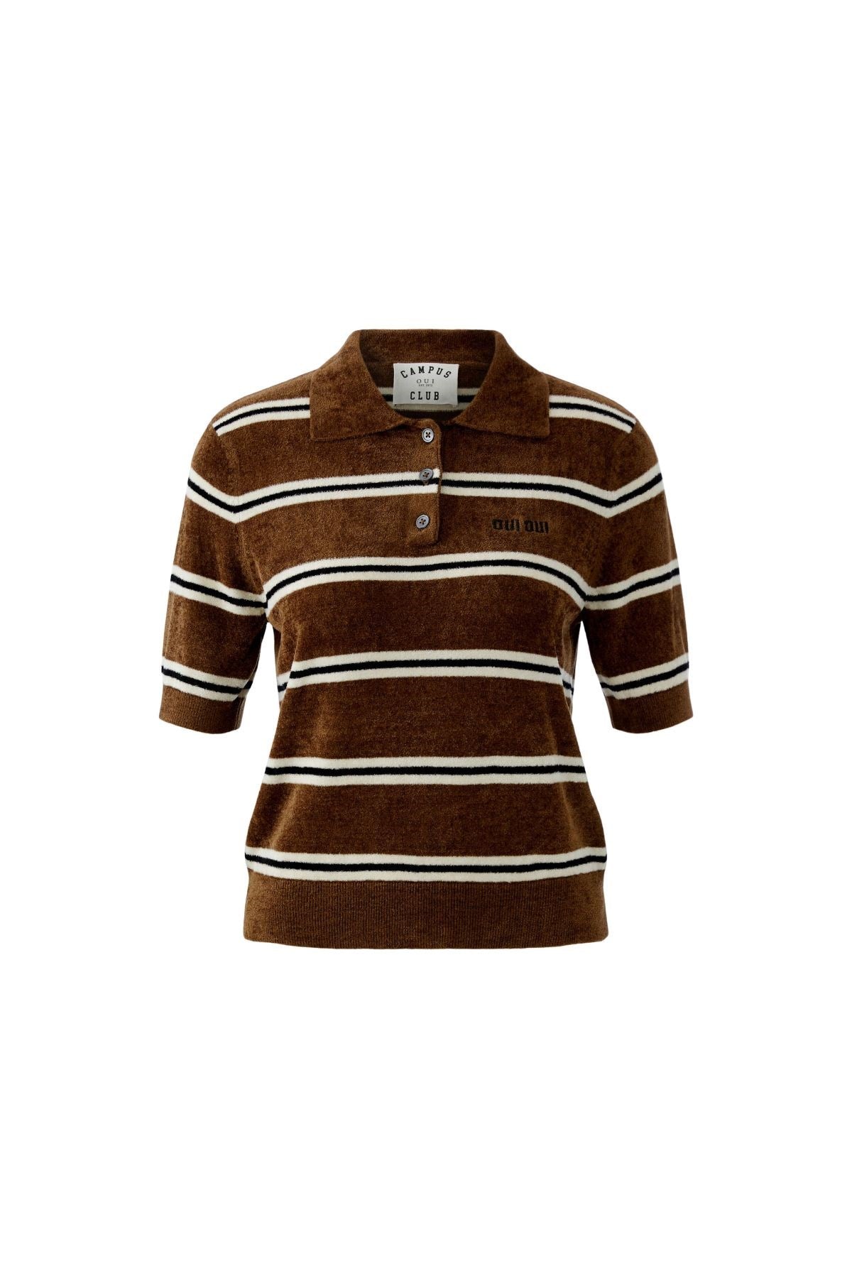 Clin d'œil nostalgique au style preppy, ce polo en maille éponge associe des rayures sportives à une texture luxueusement douce. La patte de boutonnage et le col soigné lui confèrent une touche d'élégance, tandis que la broderie « oui oui » lui donne un caractère espiègle. Idéal pour les journées où confort rime avec sophistication décontractée.