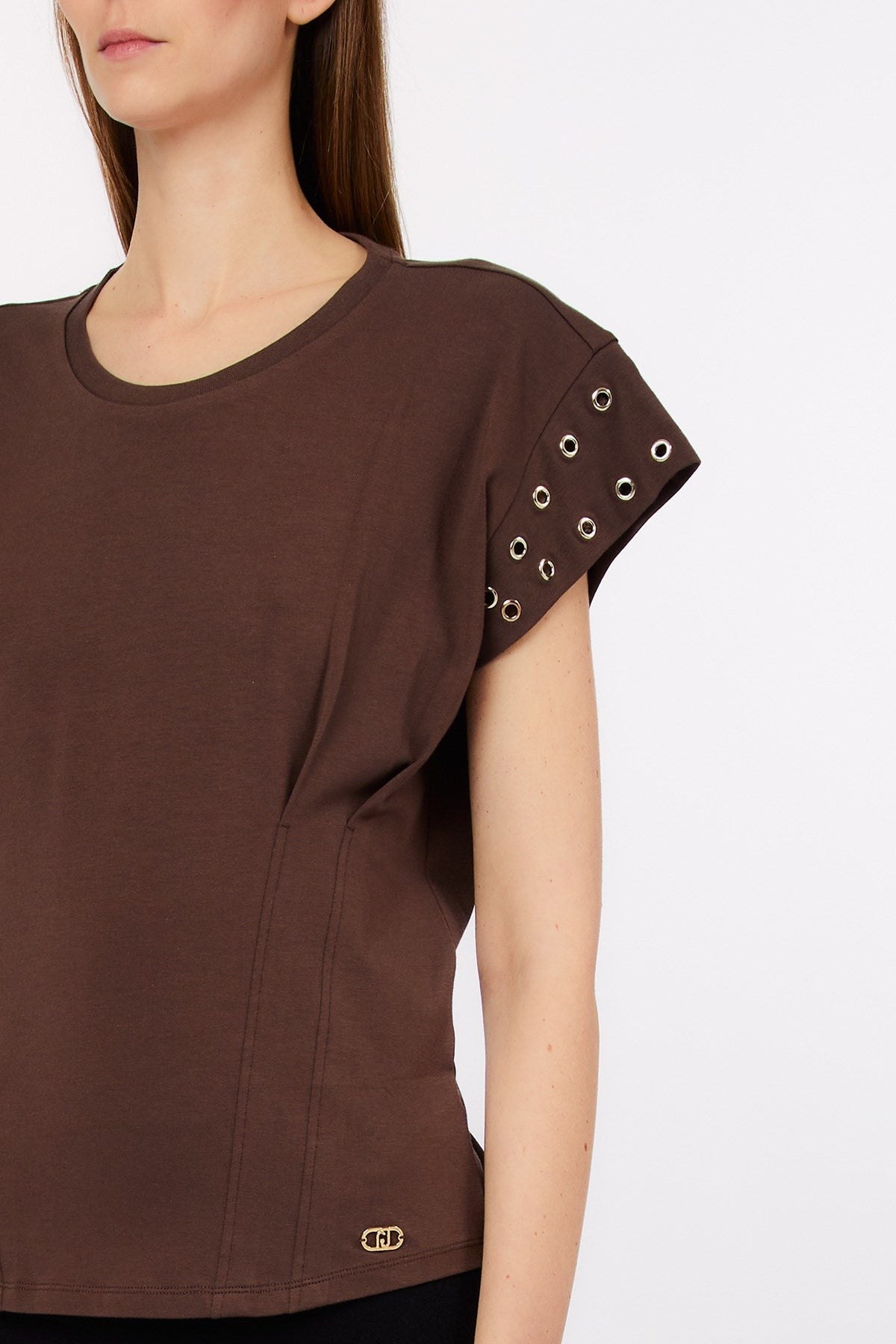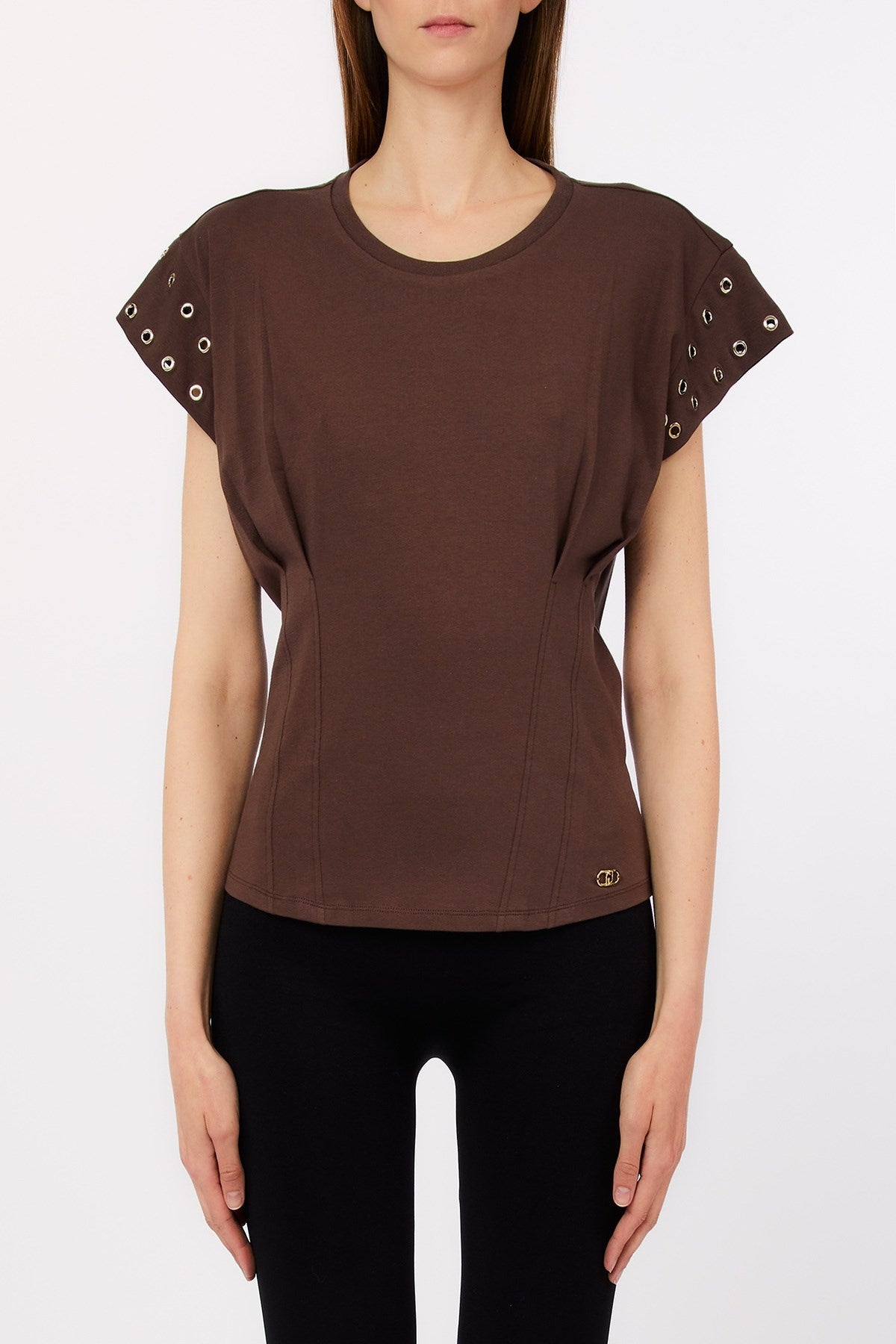 Avec sa silhouette sculptée et son style audacieux, ce t-shirt structuré rehausse les tenues décontractées grâce à ses détails œillets originaux sur les manches. Les coutures pinces et la taille ajustée créent une coupe flatteuse, alliant confort et élégance. Un discret logo métallique à l'ourlet vient compléter cette pièce à l'allure cool et assurée.