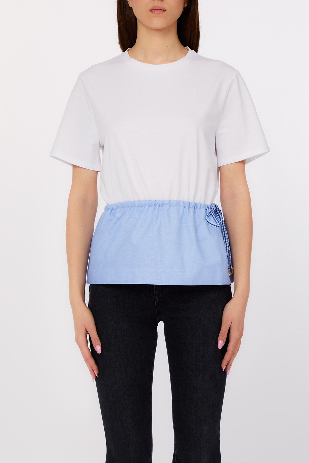 Décontracté et astucieux, ce t-shirt allie charme sportif et détails raffinés grâce à son ourlet cintré en popeline. La taille froncée crée une silhouette douce, tandis que le ruban en vichy noué sur le côté ajoute une touche ludique. C'est une pièce facile à porter qui rehausse vos tenues décontractées.