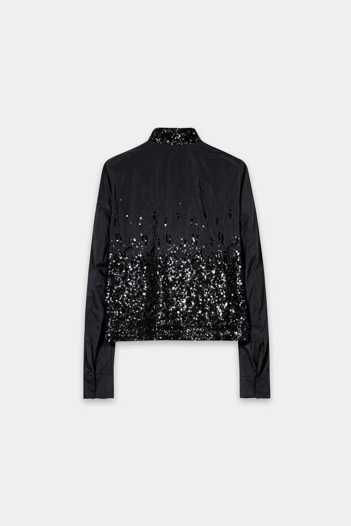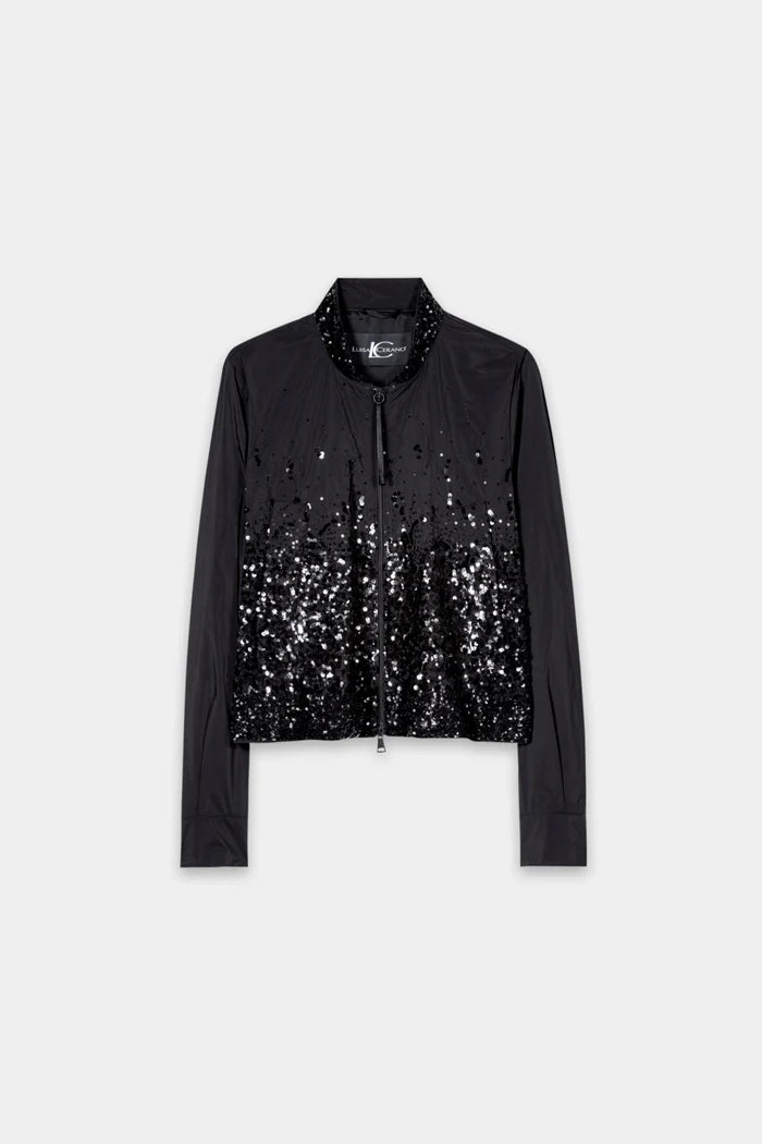 Le style sportif rencontre le glamour dans cette veste zippée éblouissante, où un tissu élégant s'associe à une cascade de paillettes scintillantes. Le col épuré et la coupe minimaliste lui confèrent un look moderne, tandis que les paillettes ajoutent une touche audacieuse. Parfaite pour affirmer votre style, de la rue à la soirée.