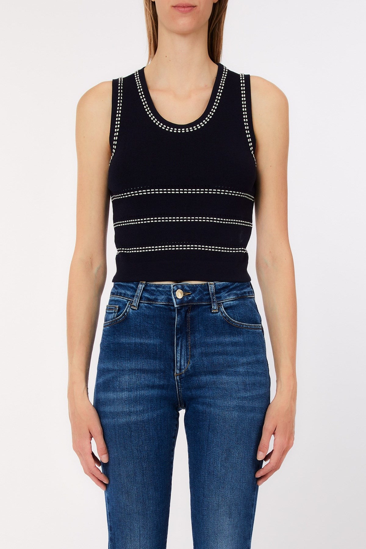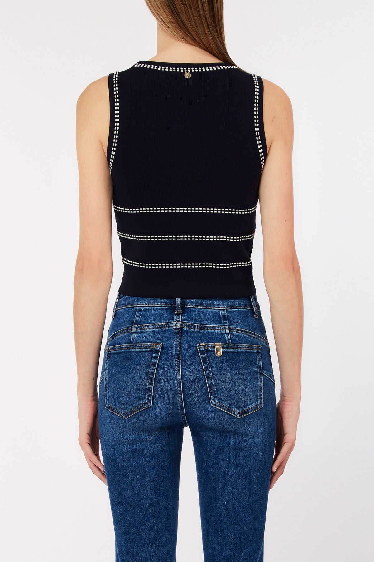 Ce haut sans manches en maille élégante et sculptée présente des coutures contrastées qui mettent en valeur la silhouette avec une touche subtilement sportive. Sa longueur raccourcie le rend parfait pour être porté avec des pantalons taille haute, tandis que sa texture côtelée assure un ajustement confortable et parfait. Chic et décontracté, c'est une pièce incontournable pour un style raffiné ou décontracté.