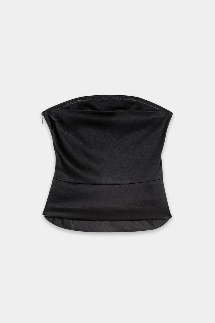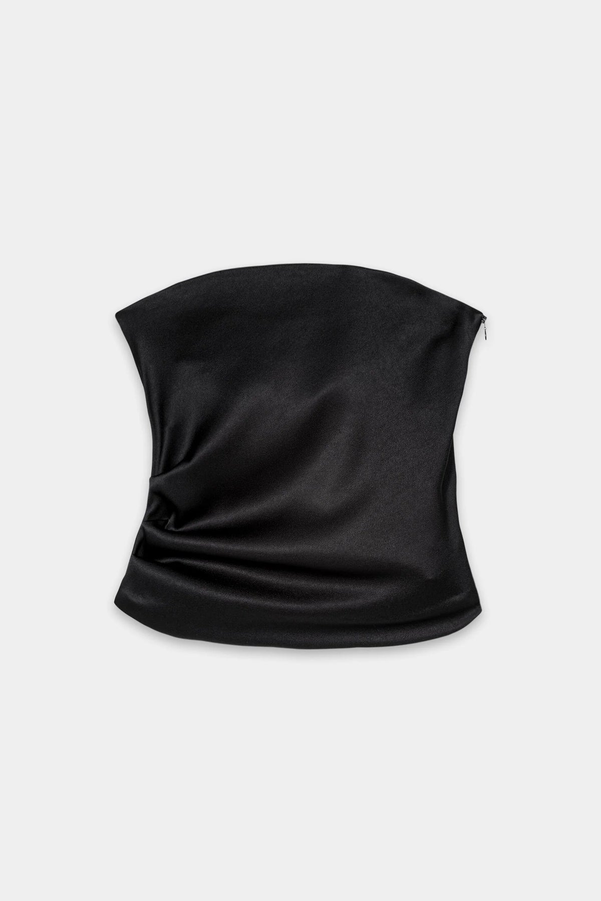 Élégant et sculptural, ce haut sans bretelles en satin est un rêve minimaliste avec une touche sensuelle. Son drapé subtil ajoute une dimension douce, tandis que sa fermeture éclair latérale dissimulée assure un ajustement parfait. Idéal à associer à un pantalon ajusté ou à une jupe originale pour une élégance nocturne.